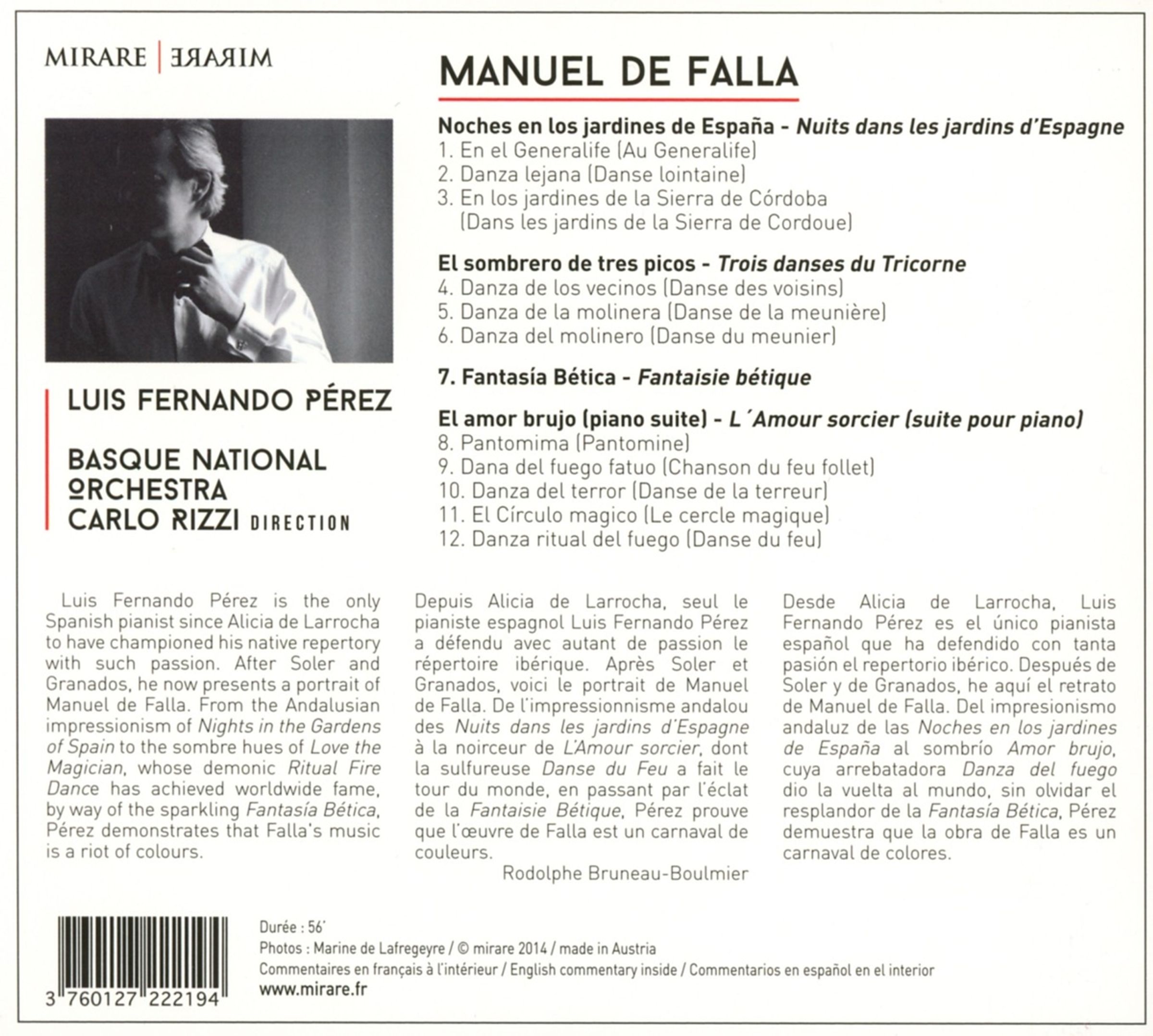 Vom andalusischen Impressionismus der Nächte in den Gärten Spaniens über die Düsternis von L'Amour sorcier, dessen sinnlicher Feuertanz um die Welt tourte, bis hin zur Brillanz der Fantasia Baetica beweist Pérez, dass Fallas Werk ein Karneval der Farben ist.