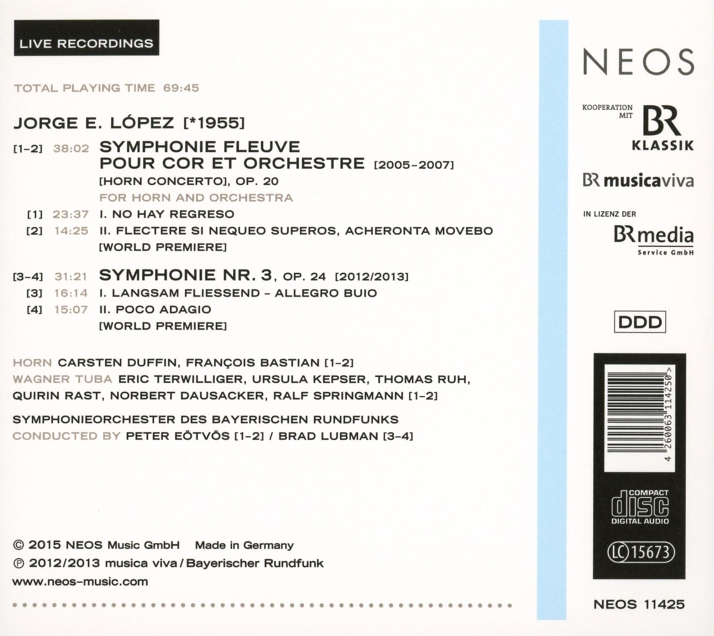 Solche abrupten und virulenten Passagen voller Kontraste, Wendungen und plötzlicher dynamischer Wechsel wurden vom Bayerischen Rundfunk vorbildlich aufgenommen, sodass die Präsenz stets sehr gut ist. Einzig die Tatsache, dass die CD in Stereo präsentiert wird und die Partituren im mehrkanaligen SACD-Format besser zur Geltung gekommen wären, schränkt sie etwas ein (oder deutlich, wenn man das Live-Erlebnis der Werke betrachtet, da die 3. Sinfonie auch eine Verräumlichung beinhaltet), mit Partituren, die im mehrkanaligen SACD-Format erfolgreicher gewesen wären. In jedem Fall ist die Präsenz herausragend, trotz des Verlusts einer sehr wichtigen Raumdramaturgie. Die Ausgabe ist die übliche NEOS-Ausgabe, mit dem bereits erwähnten, sehr illustrativen Essay von Andreas Günther und einer Reihe von Fotografien, die uns vom Bild in jene traumhaften Universen führen, die Jorge E. López ohne Zögern oder Sublimierung erforscht: und ihre wesentliche Kraft und ihre atavistische Gewalt freilegen.