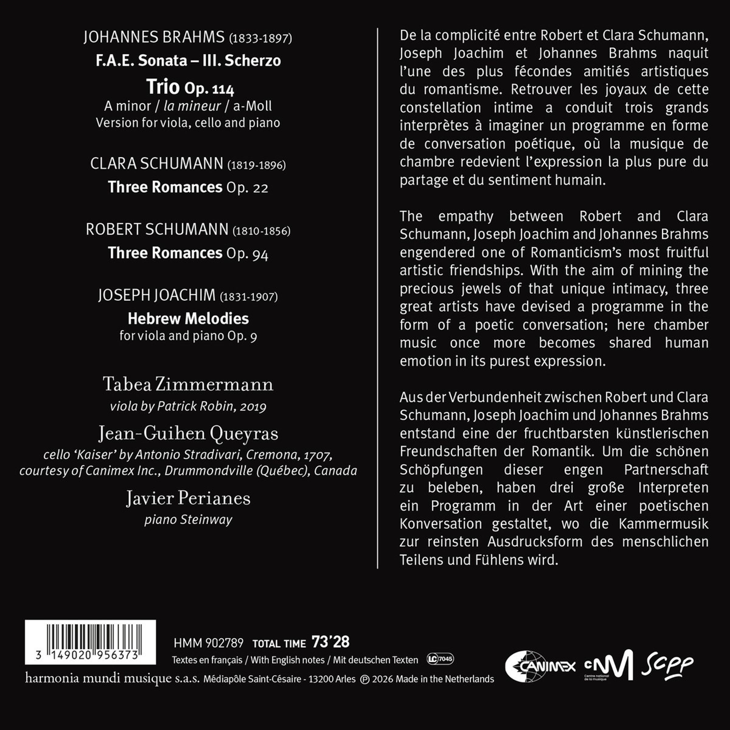 Aus der Verbundenheit zwischen Robert und Clara Schumann, Joseph Joachim und Johannes Brahms entstand eine der fruchtbarsten künstlerischen Freundschaften der Romantik. Um die schönen Schöpfungen dieser engen Partnerschaft zu beleben, haben drei große Interpreten ein Programm in der Art einer poetischen Konversation gestaltet, wo die Kammermusik zur reinsten Ausdrucksform des menschlichen Teilens und Fühlens wird.