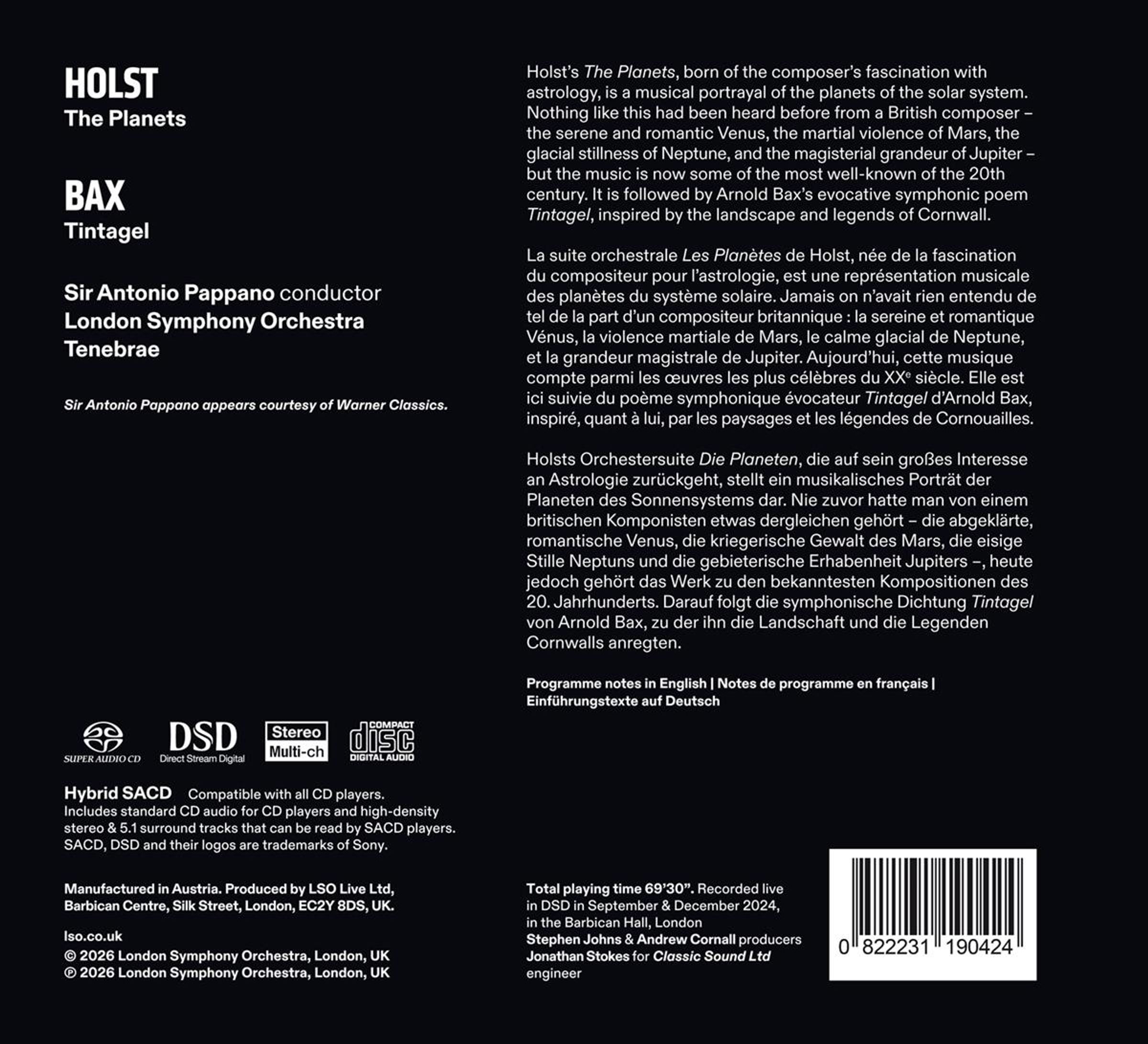 Auf diesem Album präsentieren das London Symphony Orchestra und sein Chefdirigent Sir Antonio Pappano zwei britische Meisterwerke, die nach wie vor begeistern und inspirieren. Begeben Sie sich auf eine Reise durch den Kosmos mit Gustav Holsts beliebter Suite Die Planeten. Von der unerbittlichen Energie des Mars (dem Bringer des Krieges) bis zum jubelnden Optimismus des Jupiter (dem Bringer der Fröhlichkeit), bleibt das Werk eines der visionärsten Werke des 20. Jahrhunderts. Die Reise endet geheimnisvoll mit Neptun, dem Mystiker, mit den Stimmen des Vokalensembles Tenebrae in einem wortlosen, jenseitigen Chor. Arnold Bax’ Tintagel beschließt das Album mit einem beeindruckenden Porträt der zerklüfteten Küste Cornwalls. Inspiriert von einem Besuch der legendären Burg im Jahr 1917, beschwört Bax’ symphonische Dichtung windgepeitschte Klippen, alte Geschichte und Mythologie in Musik, die wie das Meer selbst wogt.
