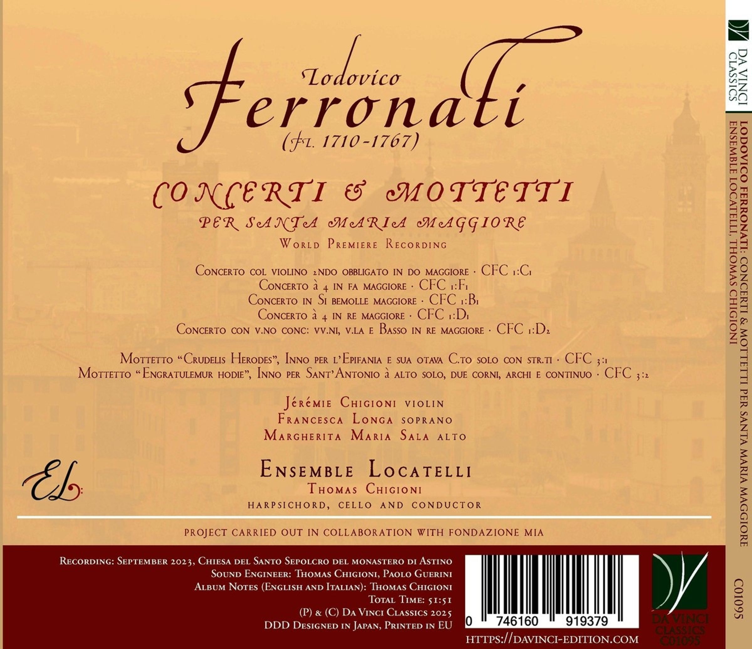 Lodovico Ferronatis Kompositionen, die für die Cappella Musicale von Santa Maria Maggiore in Bergamo komponiert wurden, verwandeln venezianische Handwerkskunst in bürgerliche Frömmigkeit. Durch die Auswertung von Manuskripten aus Bergamo, Wien und Dresden konnten neben fünf Konzerten auch zwei Motetten wiederentdeckt werden: „Crudelis Herodes“ und „En gratulemur hodie“. Die streicherlastigen dreisätzigen Konzerte mit klar umrissenen Ritornellen und gewagten Solopassagen erinnern an Vivaldi, ohne jedoch bloße Nachahmung zu sein. Aufgenommen im Kloster Astino, stellt diese Veröffentlichung ein lange verschollenes Kapitel der Bergamasker Musik wieder her.