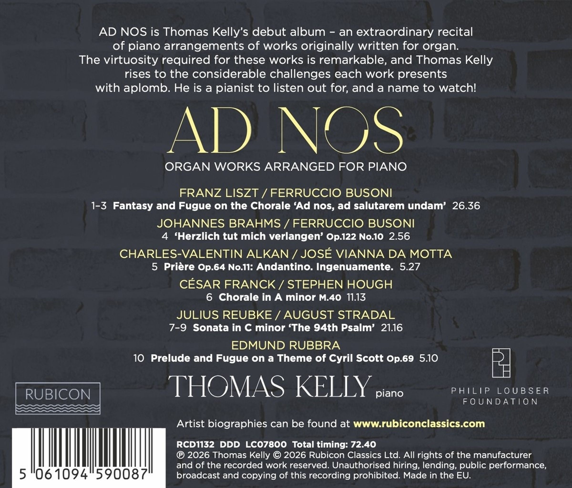 Der britische Pianist Thomas Kelly legt sein Debüt mit besonderen Arrangements von Orgelwerken vor. Liszt komponierte seine monumentale Fantasie und Fuge über den Choral „Ad nos, ad salutarem undam“ 1850, auf der Höhe seiner Weimarer Zeit – einer Periode, die von radikalsten Experimenten mit Form, Harmonie und thematischer Verarbeitung geprägt war. Das Werk beruht auf einem Choral aus Meyerbeers Oper „Le Prophète“, der mit seinen feierlichen modalen Konturen in immer neuen Verwandlungen in Erscheinung tritt. Das sinfonisch konzipierte, etwa halbstündige Stück gehört zu den eindrucksvollsten Orgelwerken der Romantik. Ferner erklingen Stücke von Brahms, Alkan, Franck, Reubke und Rubbra.