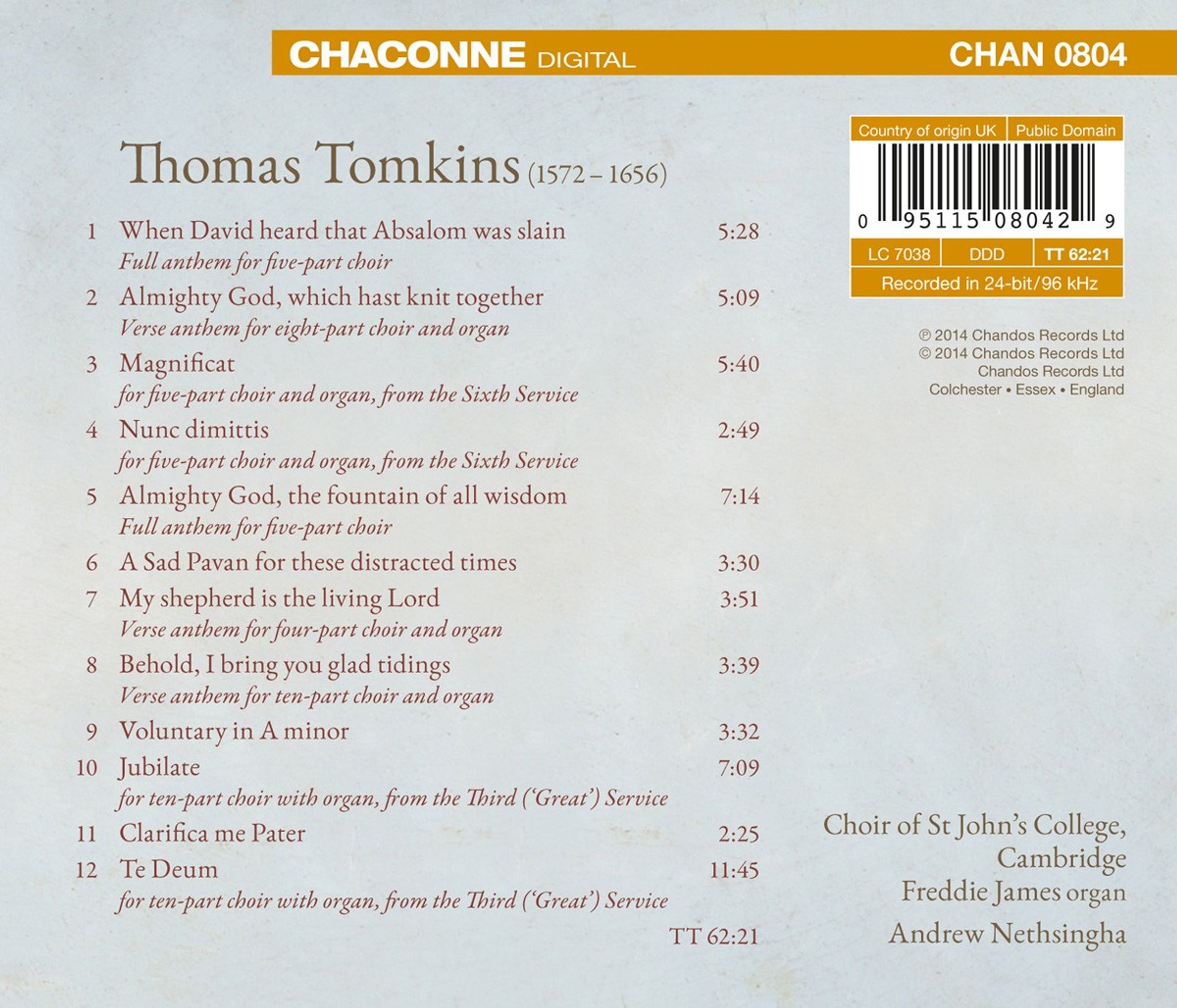 In der ersten Hälfte des 17. Jahrhunderts gehörte Thomas Tomkins zu den bedeutendsten und vielseitigsten Komponisten Englands. Eine souveräne kontrapunktische Meisterschaft und eine expressive Intensität sind Kennzeichen seines musikalischen Stils. The Choir of St. John’s College Cambridge unter Andrew Nethsingha stellt hier eine Auswahl seiner geistlichen Werke vor.