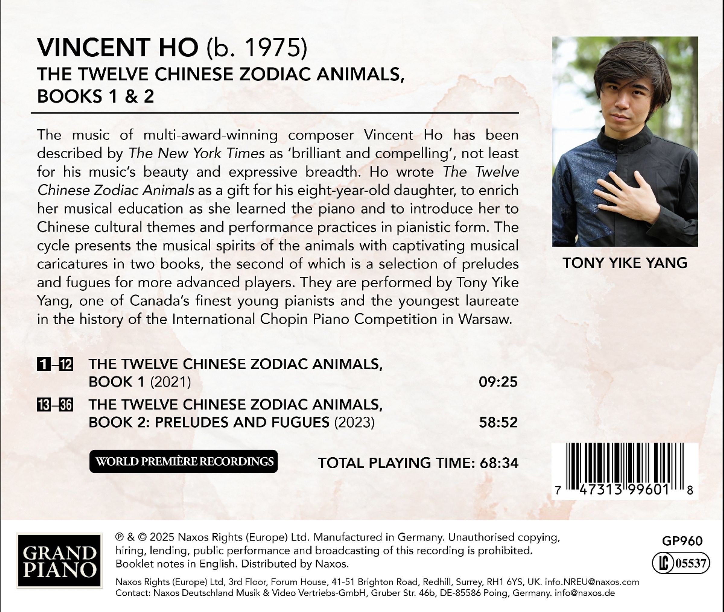 Die Musik des mehrfach preisgekronten Komponisten Vincent Ho wurde von der New York Times als 'brillant und fesselnd' beschrieben, nicht zuletzt wegen ihrer Schonheit und Ausdruckskraft. Ho schrieb "The Twelve Chinese Zodiac Animals" als Geschenk fur seine achtjahrige Tochter, um ihre musikalische Ausbildung beim Klavierlernen zu bereichern und sie mit chinesischen kulturellen Themen und Auffuhrungspraktiken in pianistischer Form vertraut zu