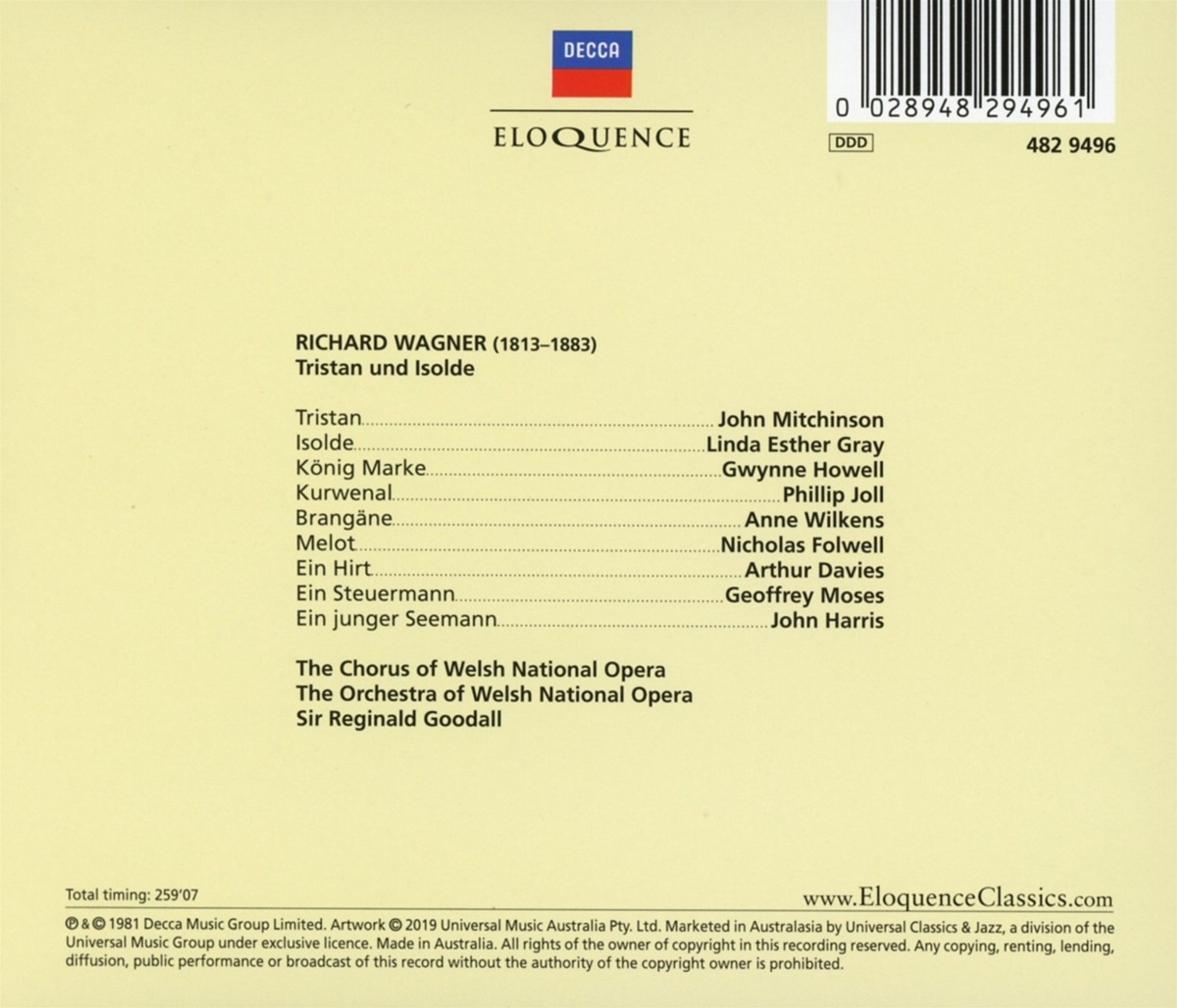 Deccas erste digitale Studioaufnahme einer Wagner-Oper, die umfangreiche Werk eines legendären Wagner-Dirigenten bewahrt. Als diese Einspielung im Winter 1980 / 81 in zwei ausgedehnten Sessions aufgenommen wurde, hatte die Welsh National Opera mit dieser Besetzung bereits 18 Vorstellungen von »Tristan und Isolde« gegeben, die meisten von ihnen unter den wachsamen Augen und dem inspirierenden Taktstock von Sir Reginald Goodall.