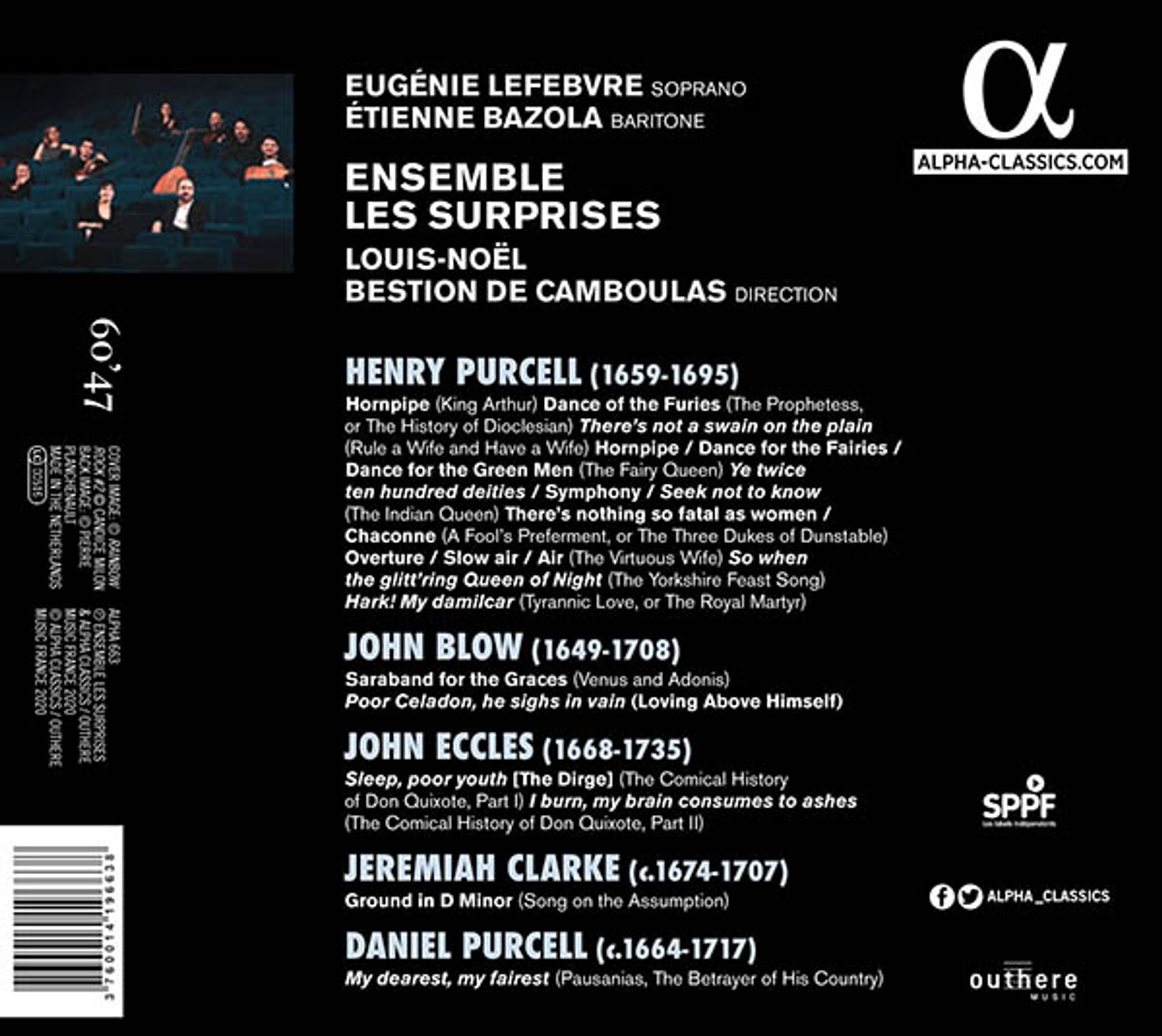 Etwa ab den 1680er Jahren intensivierten sich die Beziehungen Henry Purcells zur überaus lebendigen Theaterszene Londons und bahnten den Weg zu Meisterwerken wie etwa den Semi-Operas The Fairy Queen und King Arthur sowie zu zahlreichen Schauspielmusiken, deren beliebte Lieder und Tänze alsbald ein Eigenleben führten. Auszüge aus einigen dieser Stücke werden hier vom Ensemble Les Surprises unter Louis-Noël Bestion de Camboulas präsentiert, das mit der Aufnahme den Einstand bei ALPHA CLASSICS feiert. Das Ensemble bietet erfrischend neue Interpretationen der Musik des »Orpheus Britannicus« und erforscht deren Klangreichtum, der dank des barocken Instrumentariums hörbar wird.