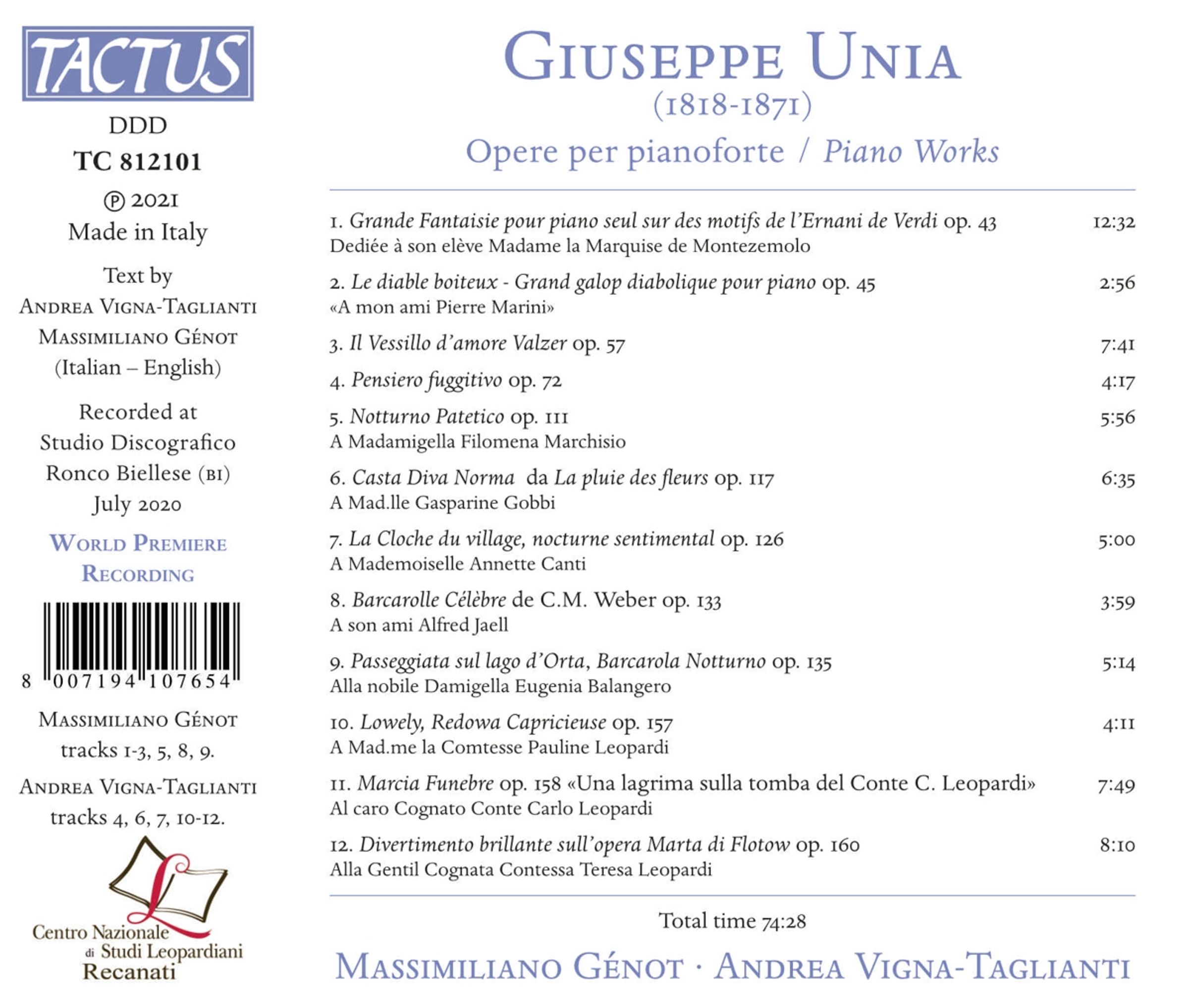 Die Pianisten Massimiliano Génot und Andrea Vigna Taglianti bieten hier eine sorgfältige Auswahl der Klavierwerke von Unia an, die den Stil und Musikgeschmack Europas seiner Zeit widerspiegeln, ein tiefgehender Kenner dieses Genres war er dank seiner zahlreichen künstlerischen Erfahrungen in Italien, Paris und Wien.