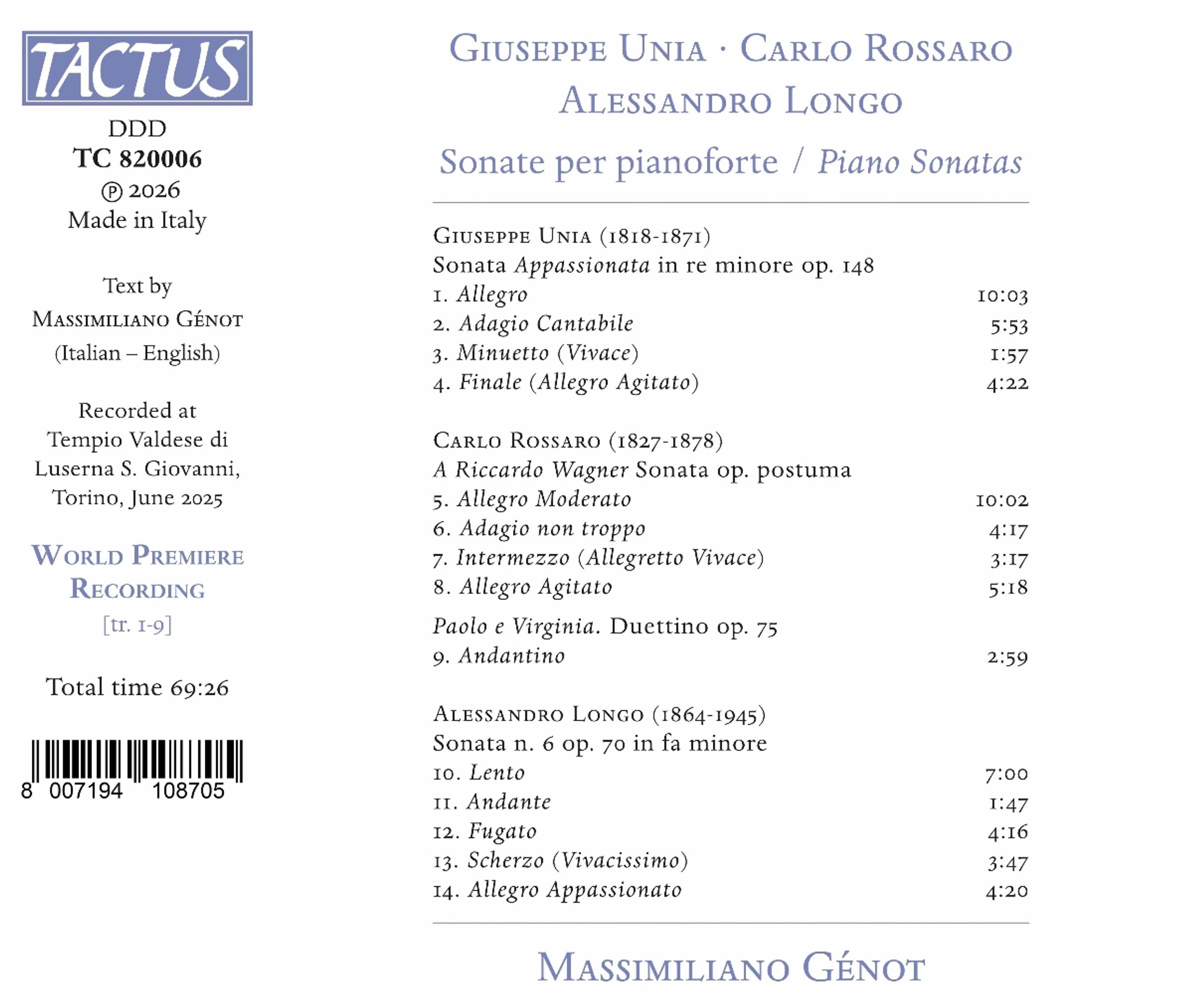Die Einspielung, die dem preisgekrönten Pianisten Massimiliano Génot anvertraut wurde (der zuvor die Wiederentdeckung der Komponisten Federico Bufaletti und Giuseppe Unia vorantrieb), konzentriert sich auf die romantische Klaviersonate im Italien des neunzehnten Jahrhunderts. Das Thema ist besonders interessant, weil italienische Klavierkompositionen des 19. Jahrhunderts heute weitgehend unbekannt sind, was zum Teil auf die überwältigende Vorherrschaft der Opern- und Theatermusik jener Zeit zurückzuführen ist, die bereits alle anderen Musikgattungen in den Schatten stellte. Massimiliano Génots leidenschaftliche Interpretation wird diesen bedeutenden Kompositionen gerecht, die eine sorgfältige Betrachtung innerhalb der europäischen Klavierlandschaft jener Zeit verdienen. Die Kompositionen von Giuseppe Unia, Carlo Rossaro und Alessandro Longo stellen eine weitreichende Synthese aus italienischer Tradition und Einflüssen von jenseits der Alpen dar, in der sich solide Kompositionstechnik und typisch italienische Ausdruckskraft auf ebenso natürliche wie meisterhafte Weise verbinden.