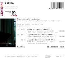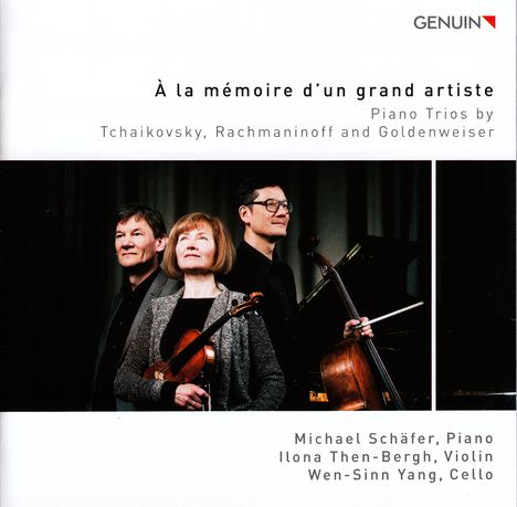 Im Gedenken an einen großen Künstler: So sind die drei Klaviertrios von Tschaikowsky, Rachmaninoff und Goldenweiser untertitelt. Michael Schäfer, Ilona Then-Bergh und Wen-Sinn Yang haben sich nun zusammengefunden, um diese Meilensteine des Repertoires neu einzuspielen. Seit Jahren sorgen sie für aufregende Wiederentdeckungen, mit denen sie kammermusikalisches und solistisches Repertoire erweitern.