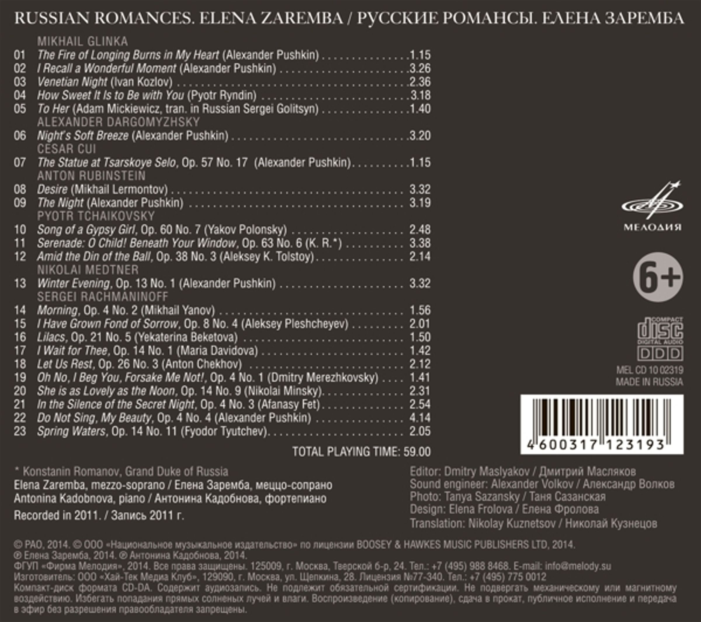 Lieder von Glinka, Dargomyshky, Cui, Rubinstein, Tschaikowsky, Medtner, Rachmaninoff