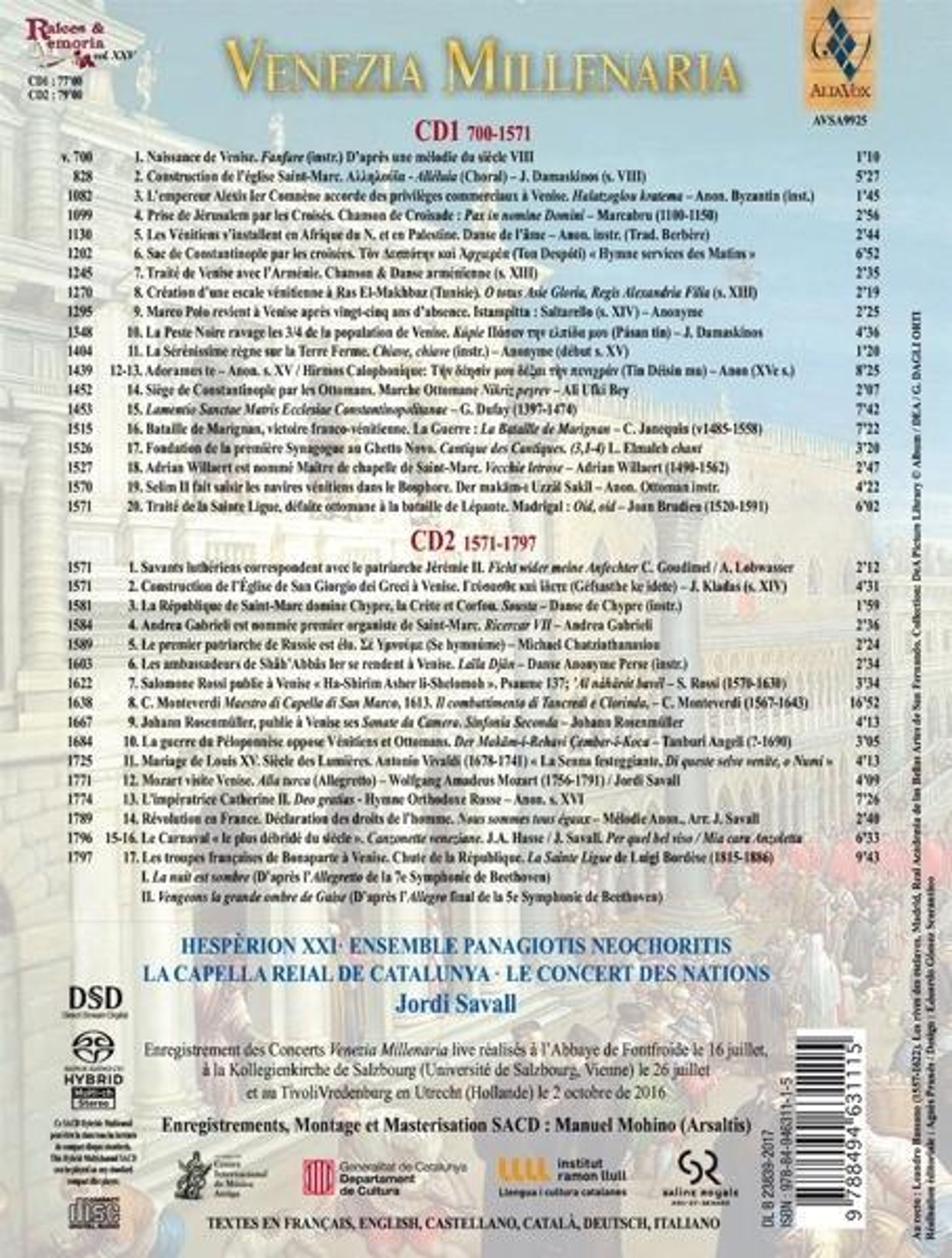 Dank des Handels und damit der Kontakte mit der gesamten mediterranen Welt war Venedig durch Einflüsse der ostchristlichen, der lateinischen und der orthodoxen Welt sowie der osmanischen, jüdischen, armenischen und muslimischen Kulturen geprägt. Alle diese Einflüsse werden durch die Musik in Savalls neuem Großprojekt heraufbeschworen, wobei die Musiker den wichtigsten Ereignissen in der fantastischen tausendjährigen Geschichte folgen, die von Personen geschaffen wurde, die dank ihres Mutes, ihres Wissens, ihrer Abenteuerlust und ihres Wunsches nach Dialog, vor allem jedoch dank ihrer Liebe zur Kunst und zur Schönheit, den Reichtum und die Freiheit ihrer Republik über diesen langen Zeitraum entwickeln und erhalten konnten. Unterschiedliche Klanglandschaften der Städte und Länder rund um das Mittelmeer werden erkundet. Die wunderbaren Sänger des orthodox-byzantinischen Ensembles unter Leitung von Panagiotis Neochoritis, Gastmusiker aus Griechenland, der Türkei, Marokko und Armenien, sowie die Solisten von La Capella Reial de Catalunya, von Hespèrion XXI und von Le Concert des Nations präsentieren religiöse und weltliche Musikstücke der ältesten orthodoxen Traditionen von Byzanz, Gesänge der Kroaten, Musik aus Istanbul und des Osmanischen Reichs, aus Griechenland, der Türkei und natürlich aus Italien. Guillaume Dufay, Clément Janequin, Adrian Willaert, Joan Brudieu, Claude Goudimel, Ambrosius Lobwasser, Giovanni Gabrieli, Claudio Monteverdi, Antonio Vivaldi, Johann Adolph Hasse – selbst Mozart und Beethoven – sowie Überlieferungen und Arrangements erklingen in dem einzigartigen Porträt Venedigs, das, wie immer bei Alia Vox, in einer luxuriösen Edition mit zwei SACDs und einem inhaltsreichen und aufwendig gestalteten Buch erscheint.