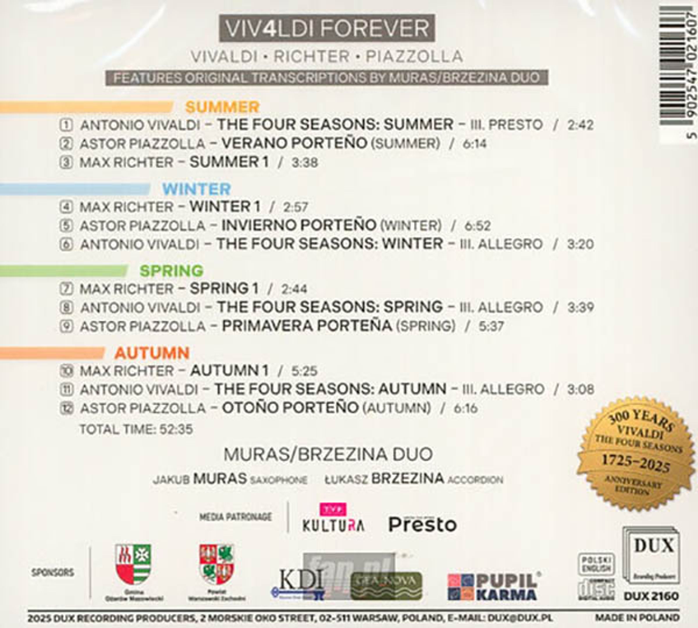 Eine Fusion aus Vivaldi, Piazzolla und Richters »Vier Jahreszeiten«! VIV4LDI FOREVER, ein Album des polnischen Duos aus dem Saxophonisten Jakub Mouras und dem Akkordeonisten Ukasz Břežina, kombiniert Vivaldis »Die vier Jahreszeiten«, Piazzollas »Die vier Jahreszeiten von Buenos Aires« und eine Überarbeitung davon durch Vivaldi, Max Richters Version von »Die vier Jahreszeiten«, die eine Überarbeitung von Vivaldis Version ist. Die drei Stücke werden miteinander verschmolzen. Anstatt jedes Stück einzeln zu präsentieren, haben Vivaldi und Richter ein »Patchwork der vier Jahreszeiten« geschaffen, indem sie Auszüge aus dem letzten Satz jedes Stücks und dem ersten Satz jedes Stücks miteinander verwoben haben. Die musikalischen Essays der beiden Musiker erforschen den Dialog zwischen Tradition und Moderne, wobei sie die Vision der Originale respektieren und gleichzeitig mit mutigen Ideen ein Arrangement schaffen, das mehr als nur ein Arrangement ist.