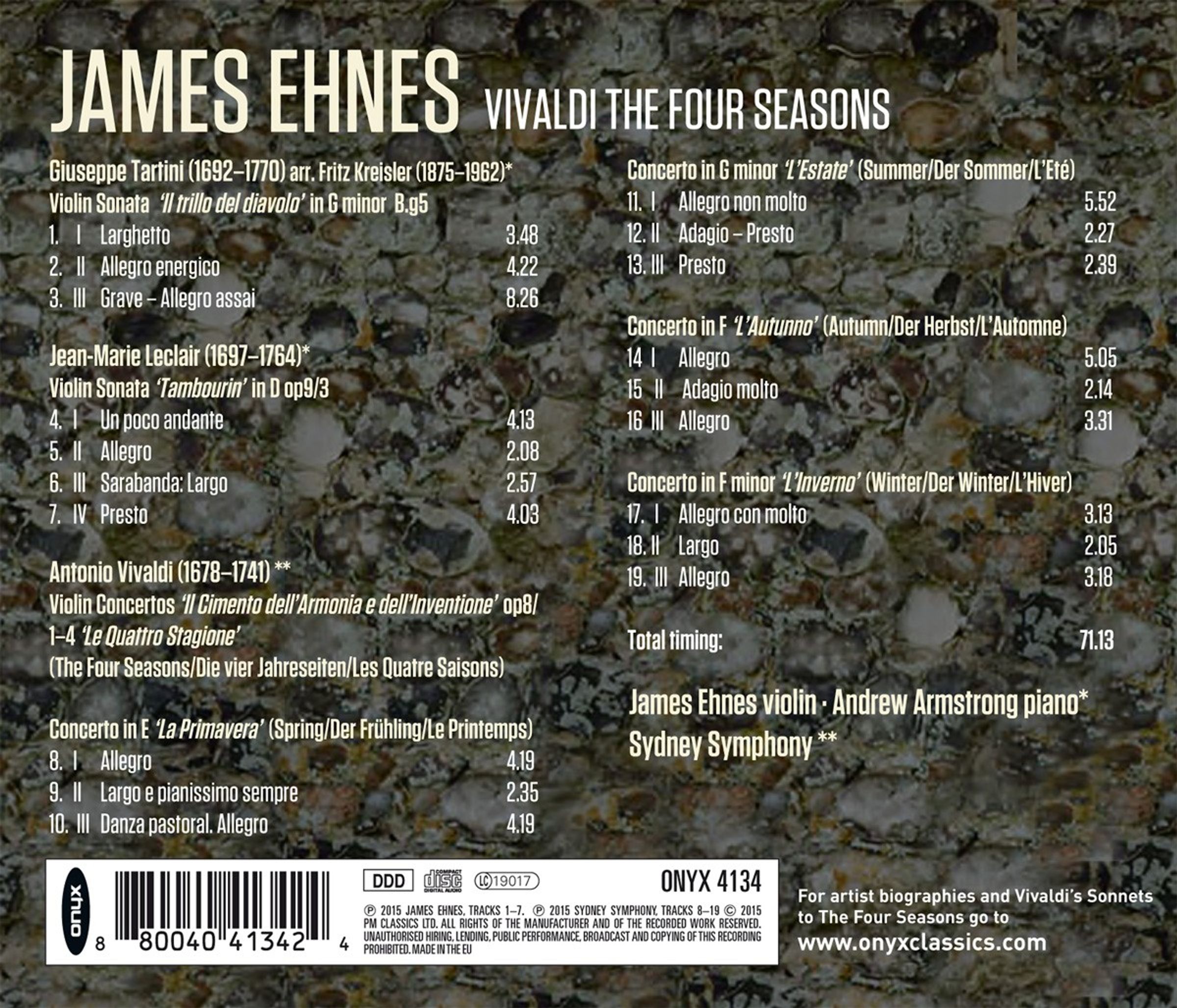 Der kanadische Geiger James Ehnes nimmt hier eine Auszeit vom Repertoire des 19. und 20. Jahrhunderts, wobei er diese keineswegs zum Ausruhen nutzt. Mit Vivaldis Konzertzyklus ›Le quattro stagioni‹ hat er sich einen interpretatorisch anspruchsvollen Barockklassiker ausgesucht, bei dem er auch die Leitung übernimmt. Die beiden Werke von Tartini und Leclair verlangen zudem einiges an Fingerfertigkeit.