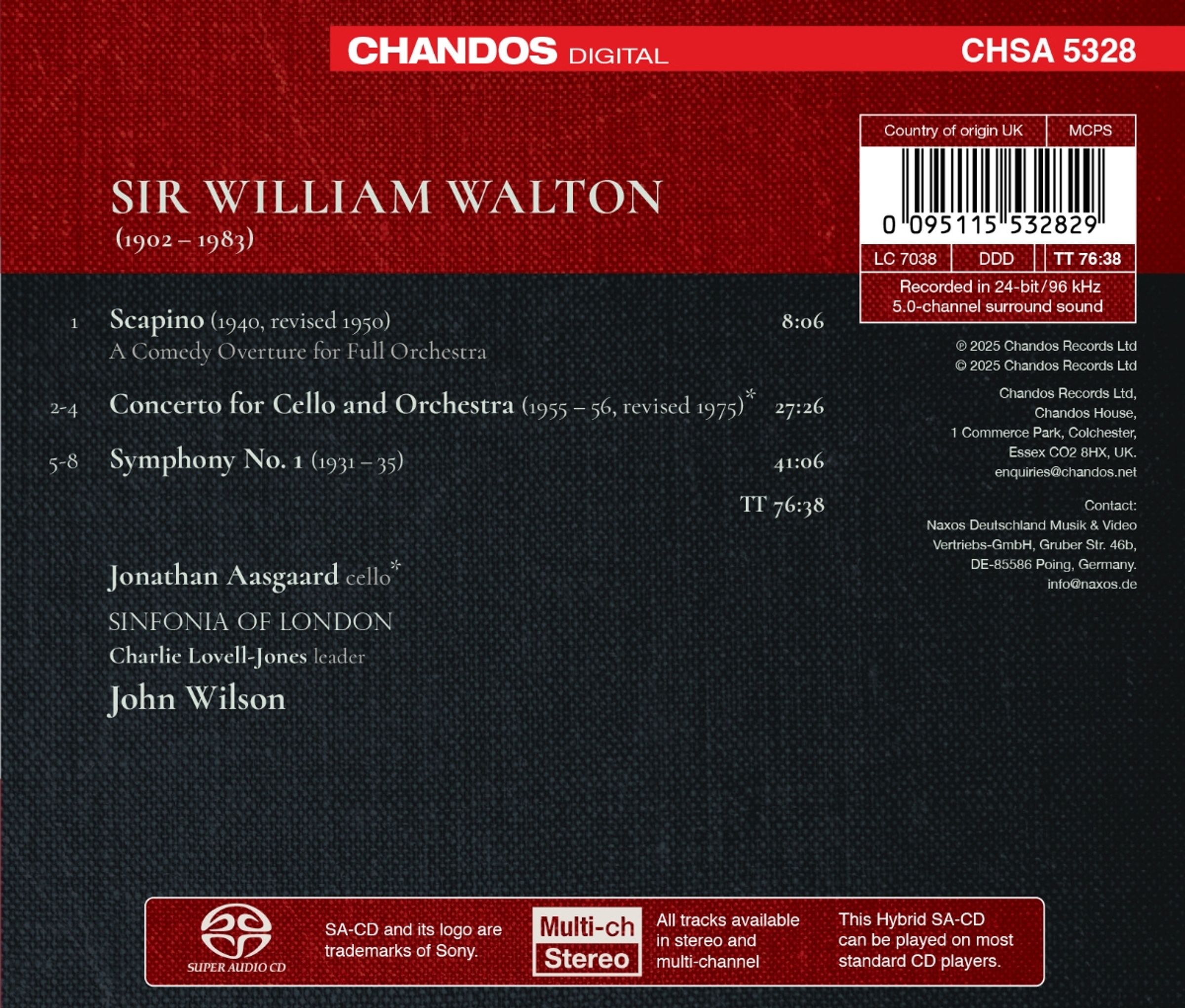 Die Erste Sinfonie wurde weitgehend von William Waltons stürmischer Liebesbeziehung mit der verwitweten Baronin Imma von Doernberg inspiriert, die der Komponist 1929 kennenlernte und mit der er Anfang der 1930er Jahre zusammenlebte. Obwohl die Entstehung des Werks lange dauerte und sich insbesondere die Komposition des Finales verzögerte, wurde das Ergebnis allgemein als herausragender Erfolg gefeiert. John Ireland kommentierte: 'Im Gegensatz zu anderen englischen Sinfonien steht dieses Werk in der echten Tradition der Sinfonik. Es ist einfach kolossal, grandios, originell und bewegt die Emotionen auf das Äußerste...'. Waltons Stern war in den 1950er Jahren im Sinken begriffen, da seine Oper "Troilus & Cressida" nicht gut ankam und sein "Cellokonzert" ebenso negative Kritiken erhielt, denn es wurde aufgrund seines im Wesentlichen neoromantischen Stils weithin als peinlich altmodisch angesehen. Das von Gregor Piatigorsky (auf Anregung von Jascha Heifetz) in Auftrag gegebene Werk wurde im Januar 1957 unter Charles Munch in Boston uraufgeführt, die britische Premiere folgte einen Monat später unter Sir Malcolm Sargent. Walton konnte diesem Konzert nicht beiwohnen, da er nach einem Autounfall auf der Fahrt von seinem Wohnort in Italien nach London ins Krankenhaus eingeliefert worden war. Das Werk, das heute weithin als eine der wichtigsten späten Kompositionen Waltons gilt, wird hier vom Solocellisten der Sinfonia of London, Jonathan Aasgaard, gespielt. Es wurde in Surround Sound aufgenommen und ist als Hybrid-SACD und in Dolby Atmos Spatial Audio erhältlich.