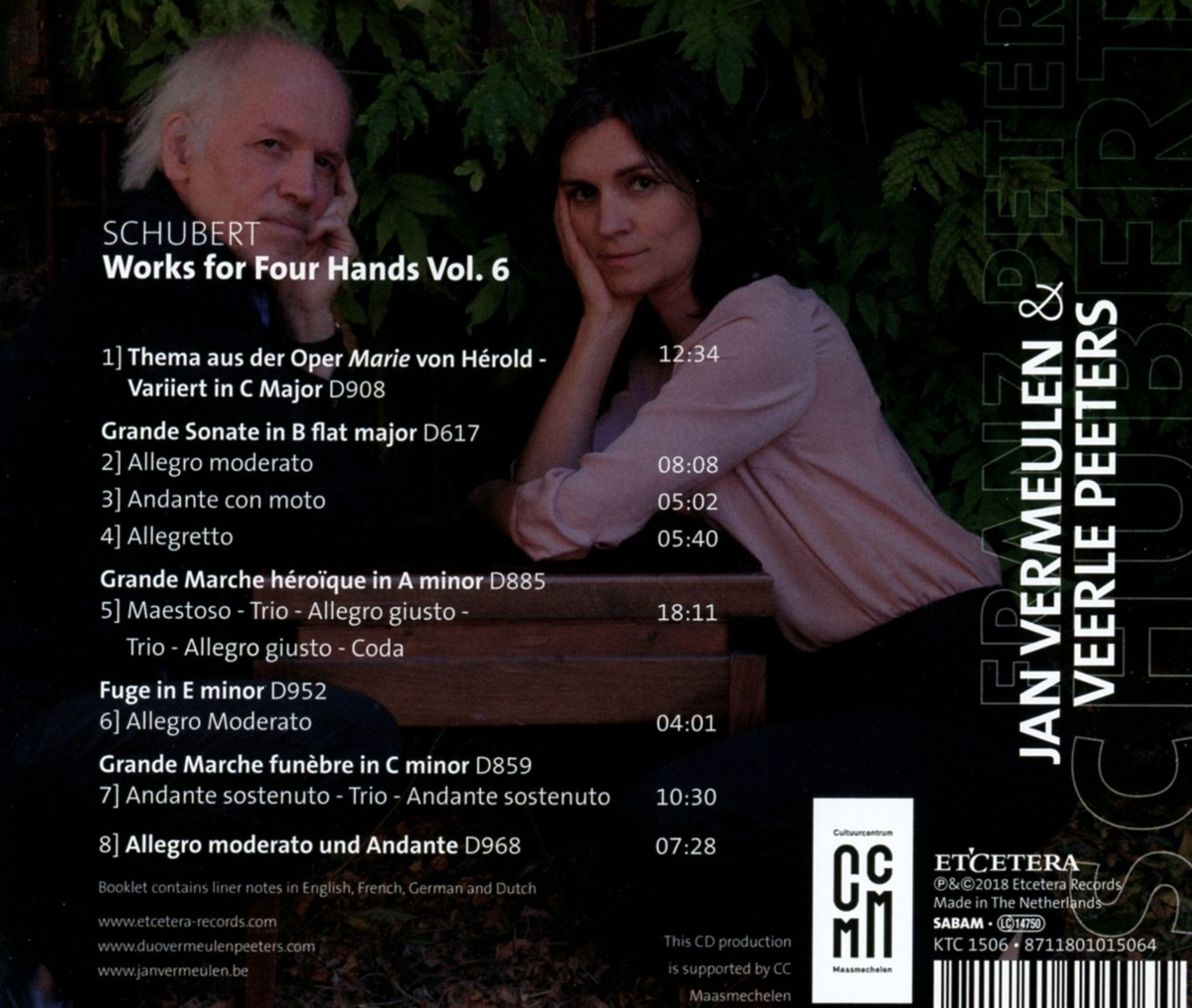 Es war zu erwarten, dass bald eine Aufnahme von Schuberts Werken für Klavierduo folgen würde. Die Suche nach einem geeigneten Duettpartner bereitete Vermeulen nicht allzu viel Kopfzerbrechen: Veerle Peeters kennt Jan Vermeulen seit etwa fünfzehn Jahren, zunächst als seine Musterschülerin am Lemmens-Institut in Leuven, dann als Partnerin bei Klavierduoabenden und schließlich als künstlerische Leiterin aller seiner Schubert-Aufnahmen bis zum heutigen Tag.