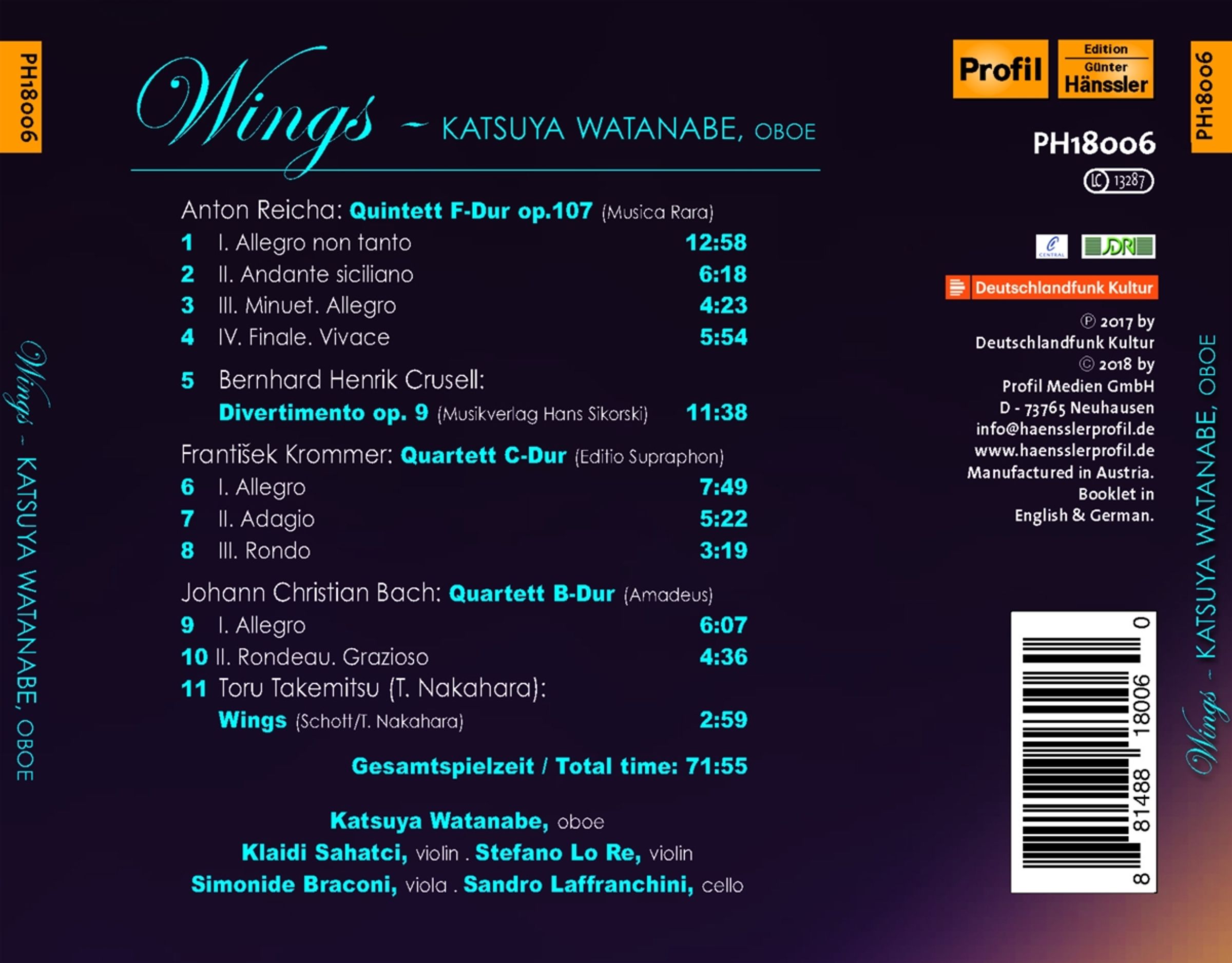 Katsuya Watanabe, 1966 in Japan geboren, erhielt seit seinem 4. Lebensjahr Klavierunterricht, seit dem 14. Jahr Unterricht auf der Oboe. Von 1985 bis 1989 studierte er an der Staatlichen Universität für Bildende Künste und Musik in Tokio, gewann daselbst 1991 den 1. Preis und den Grand Prix im Oboen-Wettbewerb und war schon während des Studiums (1988-1992) stellvertretender Solo-Oboist des von Seji Ozawa geleiteten New Japan Philharmonic Orchestra. Am Senzoku Gakuen College of Music in Tokyo hat Katsuya Watanabe eine Gastprofessur.