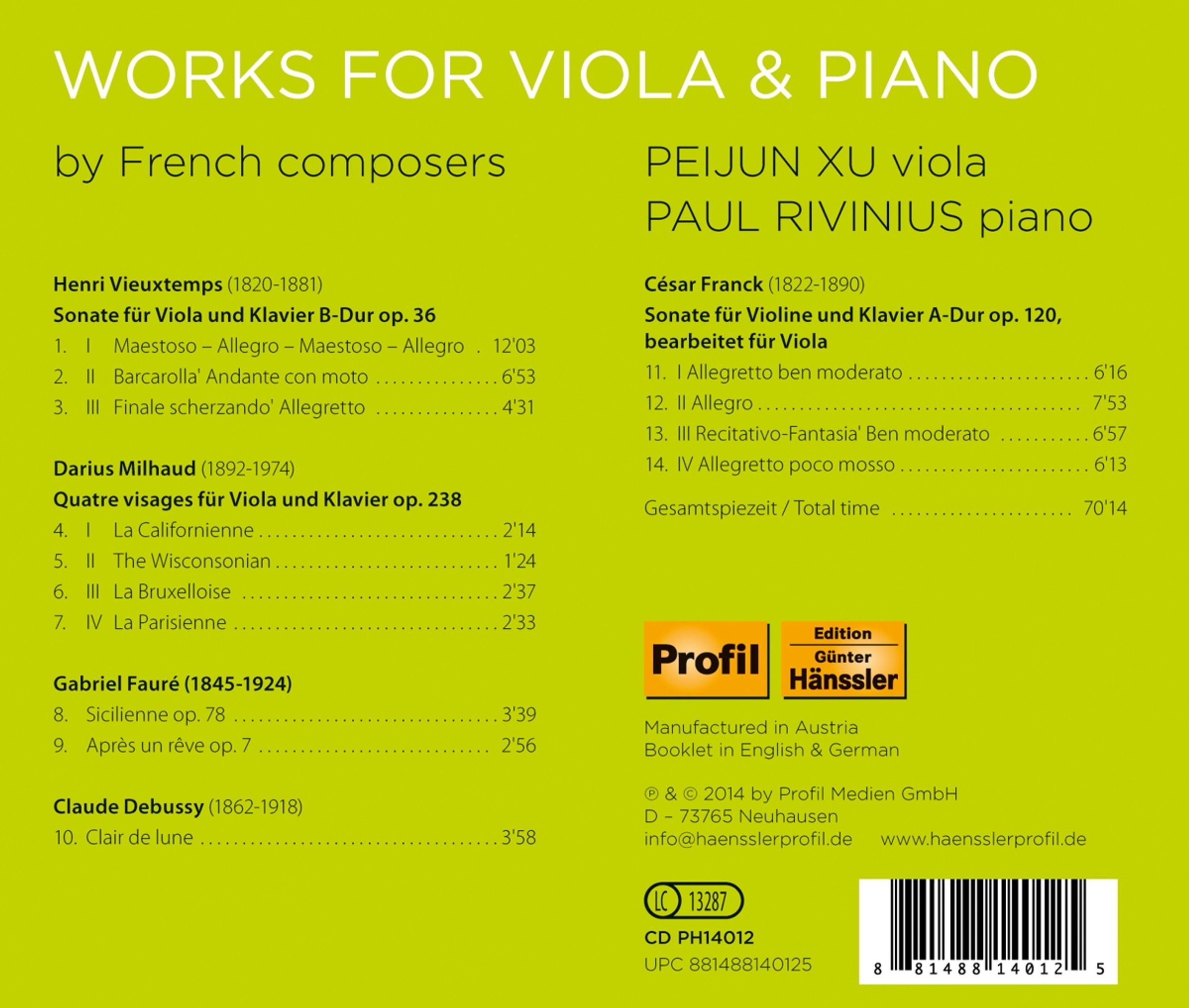 - Die in Shanghai geborene Bratscherin Peijun Xu hat u. a. bei Tabea Zimmermann studiert und zahlreiche internationale Wettbewerbe gewonnen. Auf der vorliegenden CD spielt sie Repertoire aus dem französischsprachigen Raum