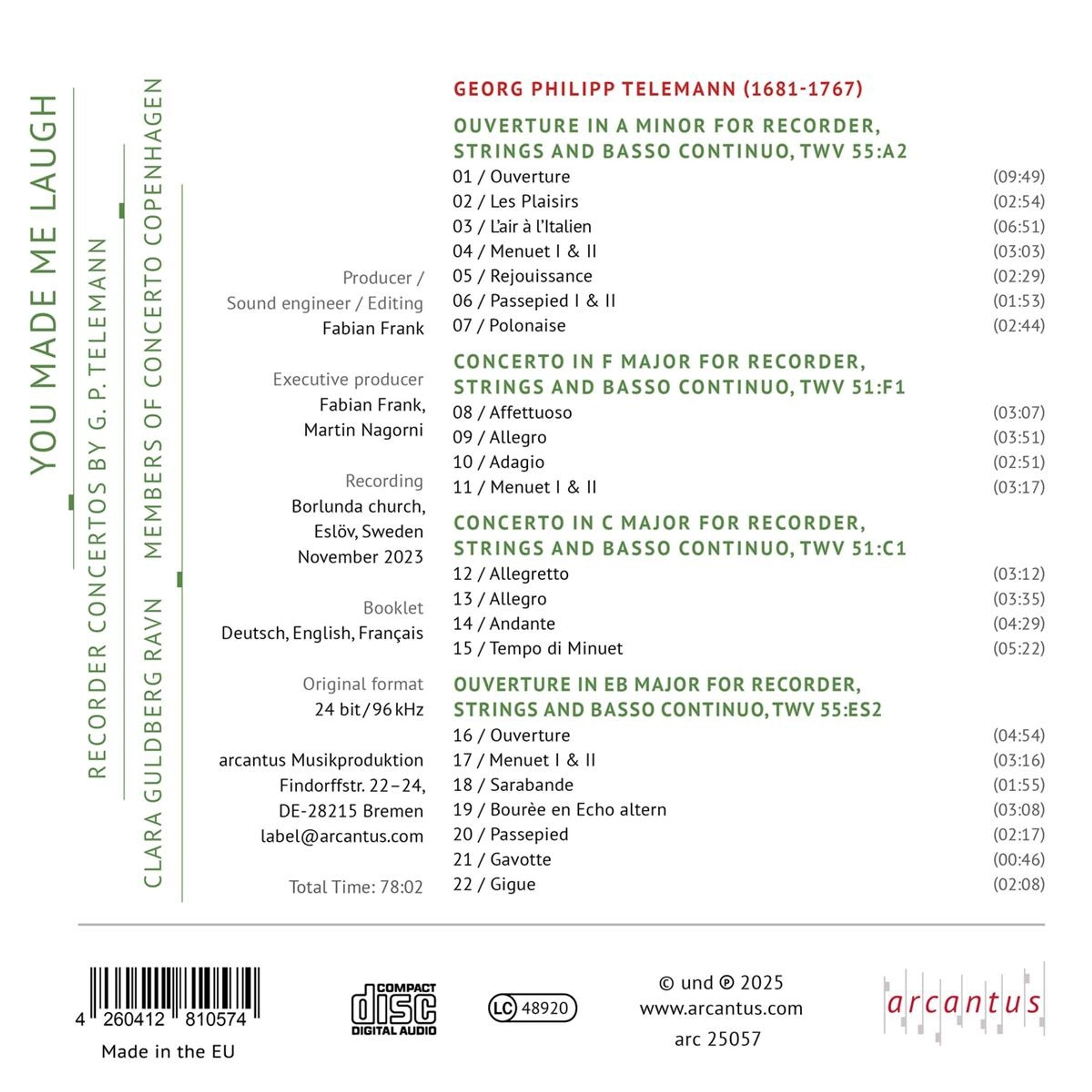 In ihrer vierten CD-Veröffentlichung widmet sich die Blockflötistin Clara Guldberg Ravn den Blockflötenkonzerten von Georg Philipp Telemann. Die Aufnahme entfaltet die ganze Ausdrucksbreite dieser Musik – von eleganter Leichtigkeit und tänzerischer Energie bis zu stiller Melancholie und feinem Humor. Gemeinsam mit Mitgliedern von Concerto Copenhagen entsteht ein lebendiger, ausgewogener Gesamtklang, in dem der dialogische Charakter der Werke deutlich hervortritt. Virtuosität dient hier stets dem musikalischen Ausdruck. Die Einspielung eröffnet einen unmittelbaren Zugang zu Telemanns Blockflötenmusik und lädt dazu ein, ihre emotionale Tiefe und Vielfalt neu zu erleben.