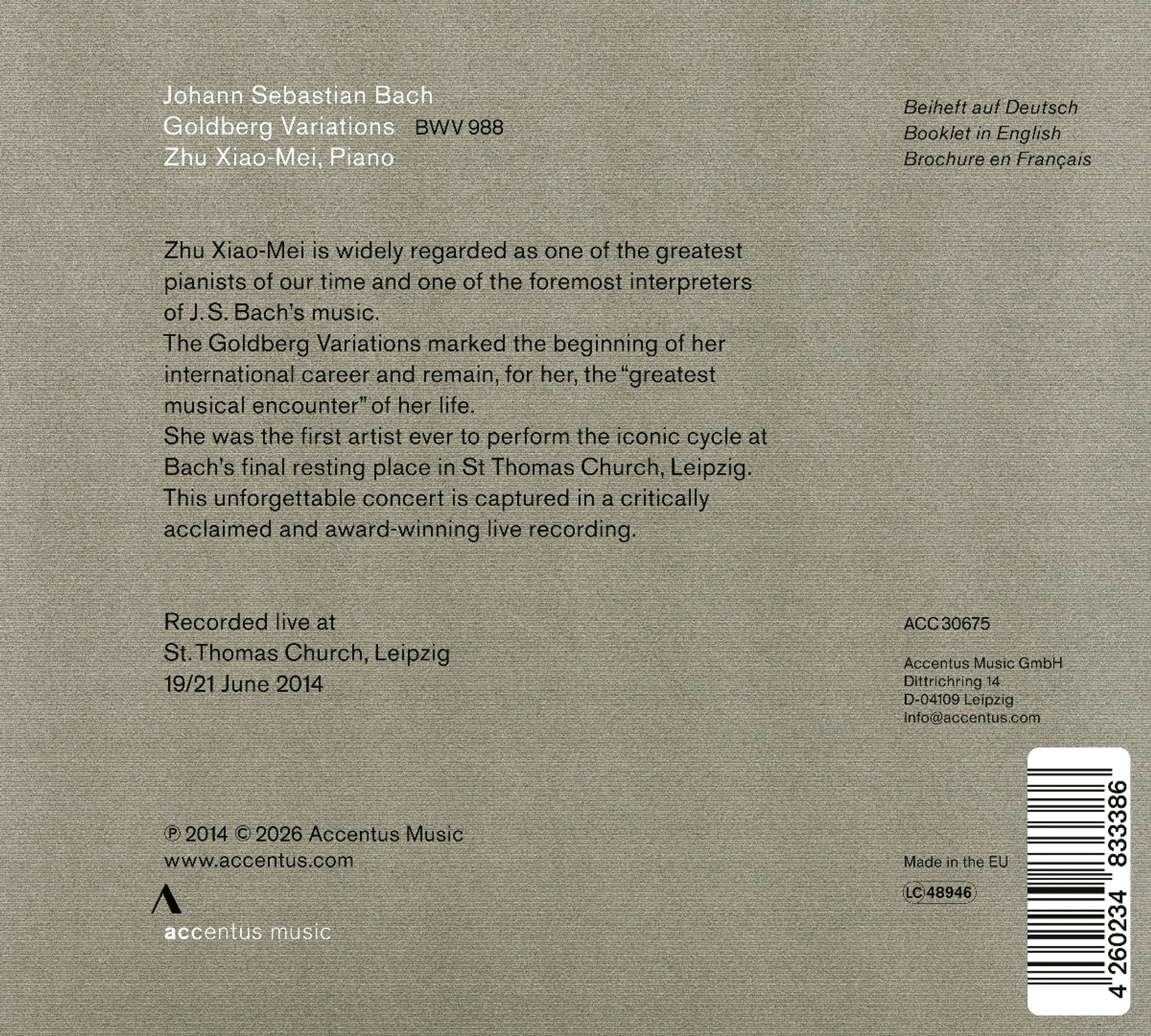 Zhu Xiao-Mei gilt weithin als eine der herausragendsten Pianistinnen unserer Zeit und als eine der bedeutendsten Interpretinnen der Musik Johann Sebastian Bachs. Die Goldberg-Variationen markierten den Beginn ihrer internationalen Karriere und sind fur sie bis heute die 'grosste musikalische Begegnung' ihres Lebens. Als erste Kunstlerin uberhaupt fuhrte sie diesen ikonischen Zyklus an Bachs letzter Ruhestatte, der Thomaskirche in Leipzig, auf.