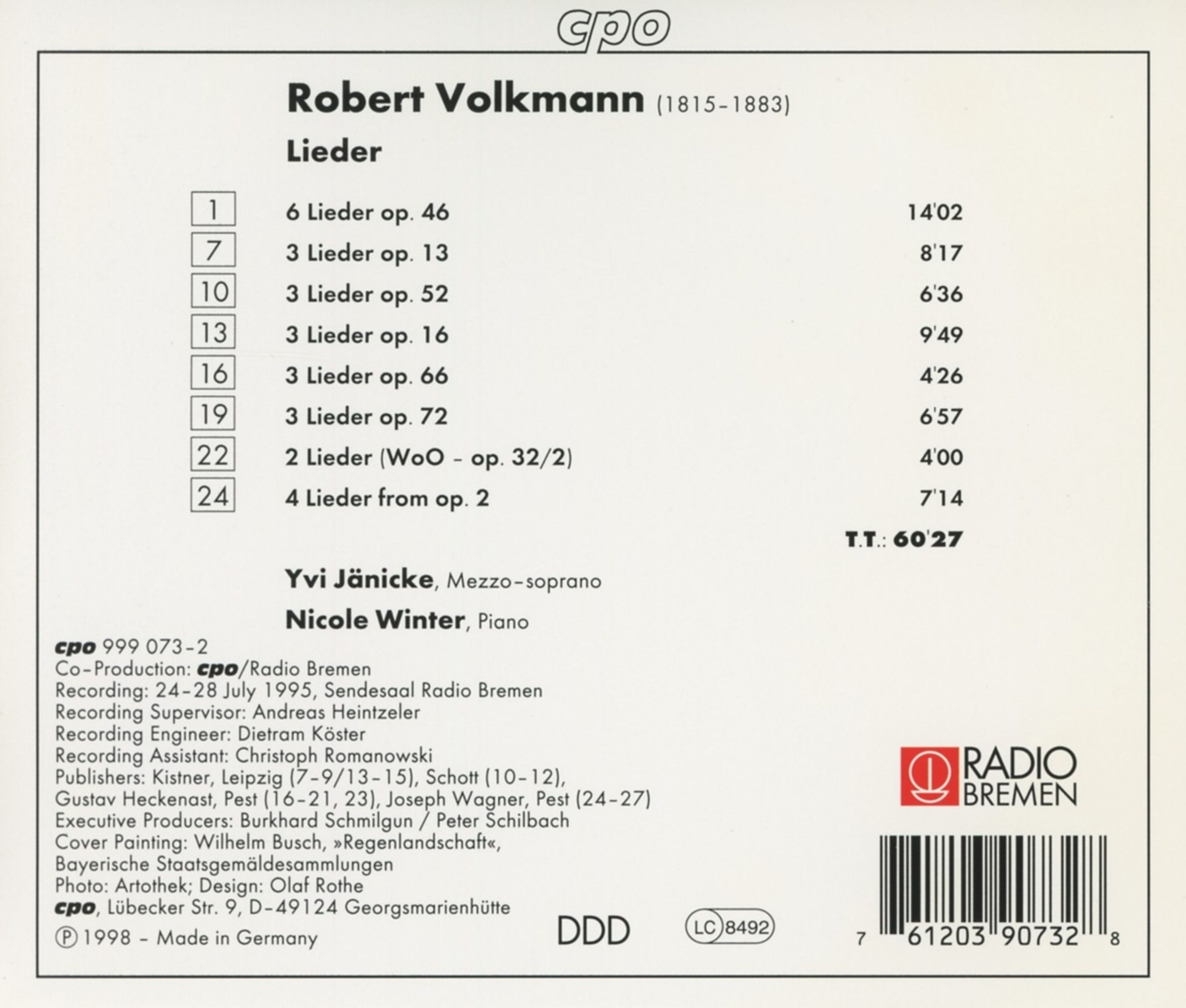 cpo hat schon vor einigen Jahren mit den Orchesterwerken und der Kammermusik auf diesen romantischen Meister mit Nachdruck hingewiesen, nun beschließen wir unsere Volkmann-Veröffentlichungen mit diesen Lied-Juwelen.