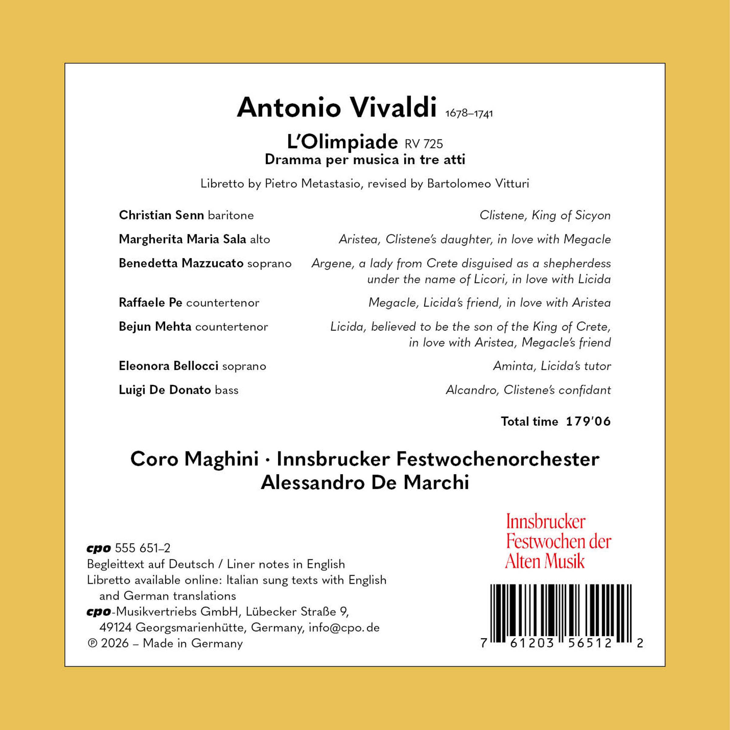 - Bejun Mehta, Margherita Sala, Raffaele Pe, Luigi de Donato, Benedetta Mazzucato, Christian Senn, Coro Maghini, Innsbrucker Festwochen Orchester, Alessandro De Marchi