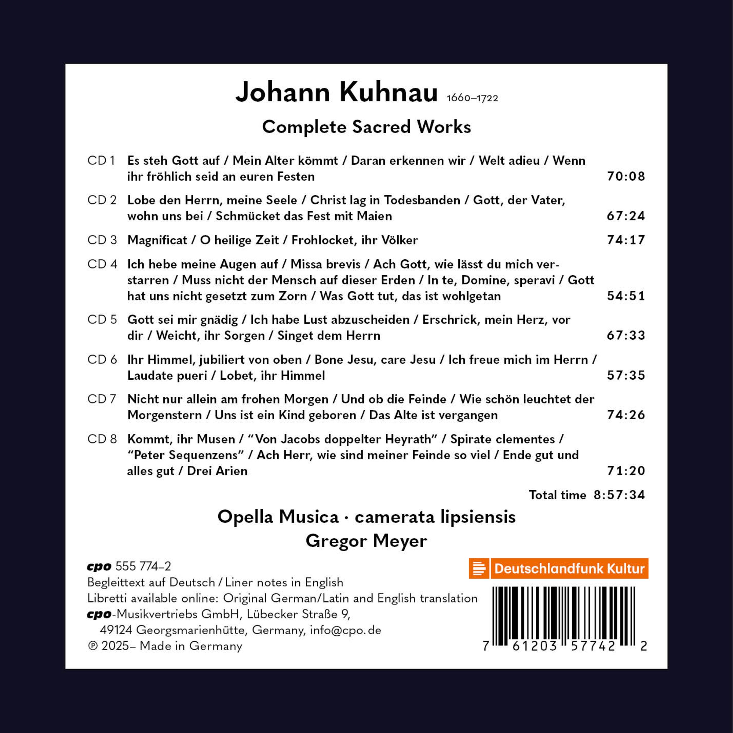 "Johann Kuhnau, Complete Sacred Works, Opella Musica, Gregor Meyer" mit historischem Stadt-Illustration und Logo., 8 CDs