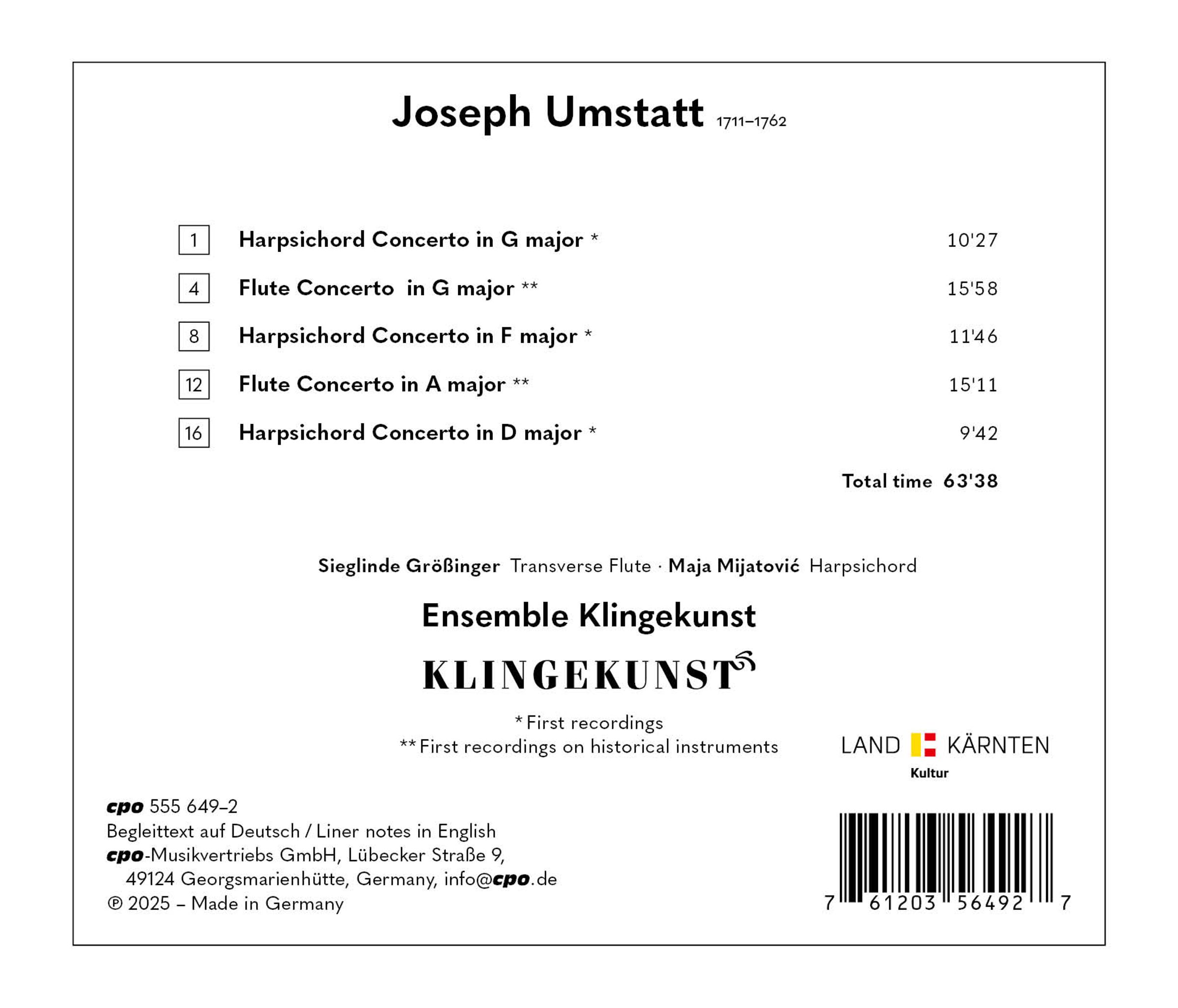»Das ist schlicht gesagt exzellent, reich an schönsten ›Affecten‹, wunderbar durchsichtig im Klang, in den schnellen Sätzen mit dem leichten Hauch von Swing, der diese Musik so richtig aufblühen läßt, spritzig im Allegro, und in den langsamen Sätzen herrlich sentimental (also keineswegs nachgesüßt)«: So schrieb uns ein Rezensent, der diese Produktion schon vor ihrer Veröffentlichung begutachten konnte. Tatsächlich sind die hier erstmals auf Originalinstrumenten eingespielten Concerti von einer aparten Schönheit, die sie »des Aufhebens wert« macht. Ihr Verfasser Joseph Umstatt (1711–1762) erweist sich in den ebenso virtuosen wie schwerelosen Kreationen als Kenner und Könner des galanten Stils, der damals die gesamte Musikwelt im Sturm eroberte – wie hätte er sonst die letzte Dekade seines Lebens als Hofkomponist und -kapellmeister des Bamberger Fürstbischofs zubringen können?