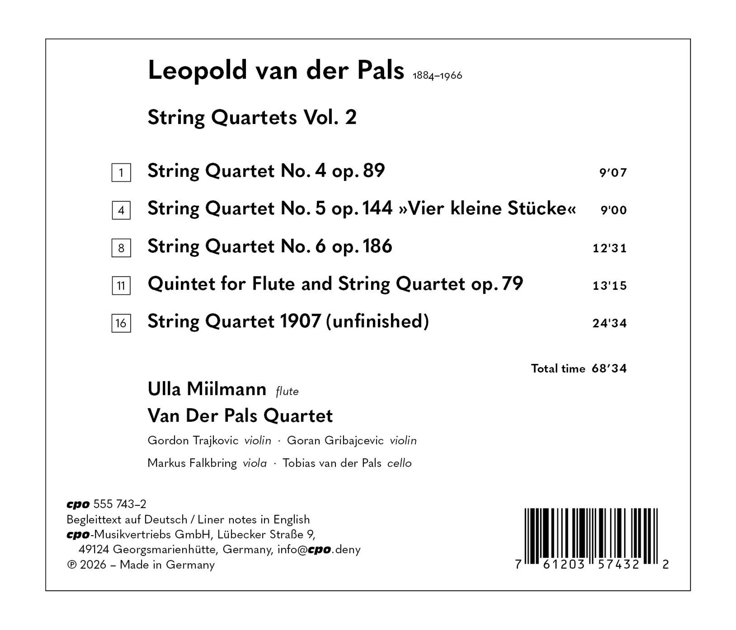»Vorzügliche Musik zwischen Spätromantik und Impressionismus, die [...] unbedingt verdient, gehört zu werden.« Den Worten des Rezensenten, der für klassik-heute den ersten Teil dieser Gesamteinspielung besprach, ist nicht viel hinzuzufügen: Leopold van der Pals, in Russland aufgewachsener Spross dänisch-niederländischer Eltern, war sein Leben lang auf der Suche nach den Wahrheiten, die sich in höheren Welten auftun – durch den Naturwissenschaftler Goethe und seinen geistigen Nachfolger Rudolf Steiner, durch eigene Erfahrungen und immer neue Auseinandersetzungen mit den Möglichkeiten der unendlichen Metamorphose, denen alles Werden ausgesetzt ist. Die aktuelle Veröffentlichung beschließt den Zyklus der Streichquartette und präsentiert zudem als Bonus das klangschöne, aparte Quintett für Flöte und Streicher, das in seinem Verzicht auf alle virtuosen Attitüden auf besondere Weise für den Komponisten einnimmt.