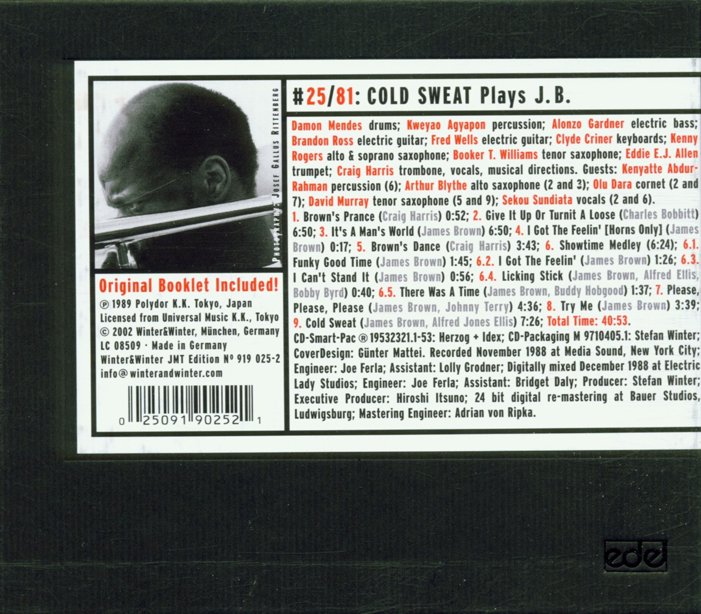 Der Schwung, die Energie und der Soul des Funkgiganten bleiben voll erhalten, wenn Cold Sweat genüßlich It's a Man's World zelebriert oder ein ausgelassenes Please, Please, Please in die Welt setzt. Den heißen Groove des Rhythm & Blues kombiniert Cold Sweat mit intelligenten Arrangements, satte Jazz-Klangfarben, funkigen Bläserstakkati und effektvollen Soli. Die lyrische Seele des James Brown erfühlt ganz besonders die Posaune von Craig Harris.