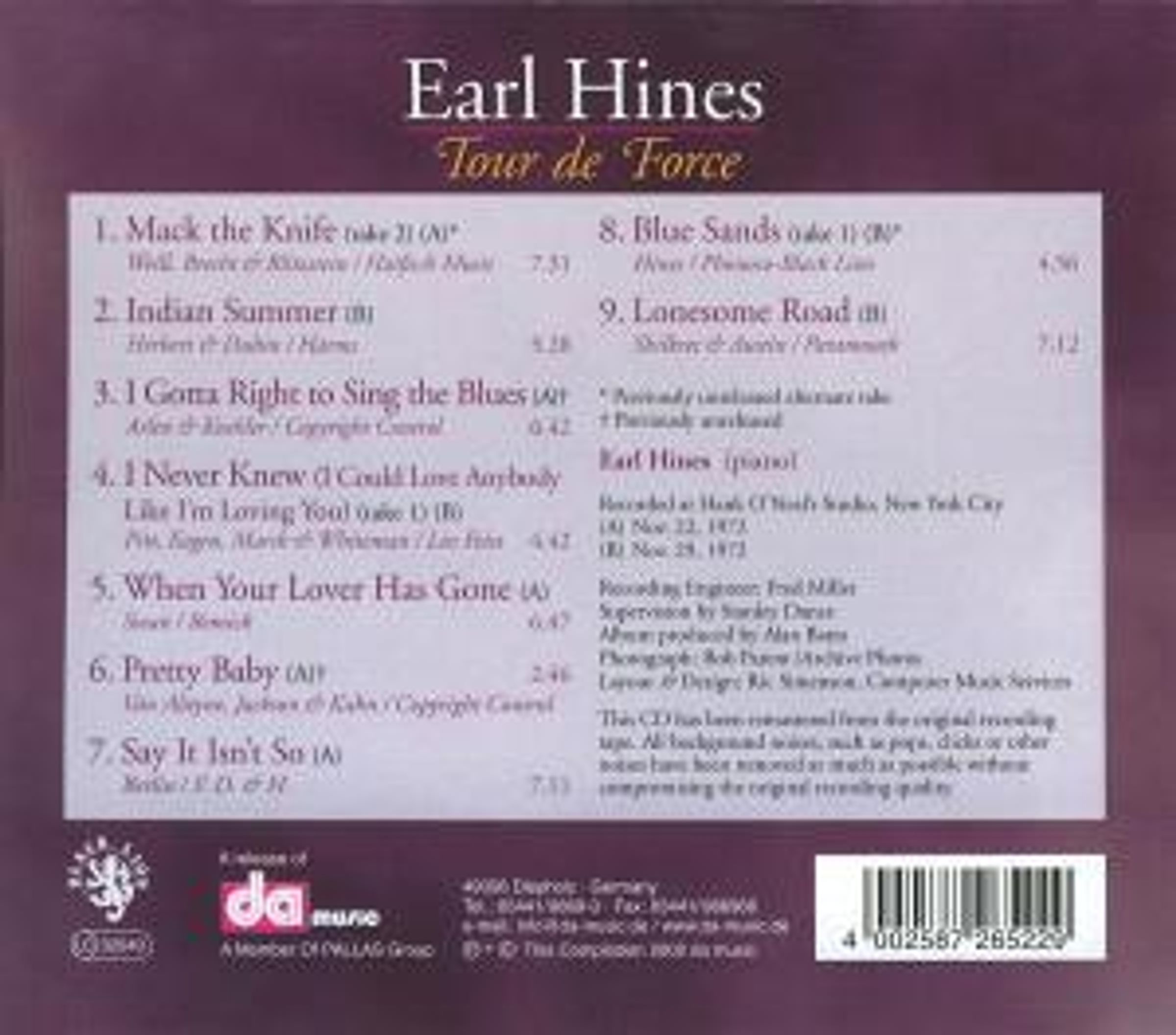 Der einflussreiche Jazzpianist Earl Hines ist in Top-Form bei dieser brillanten Soloaufnahme, die im November 1972 in New York aufgezeichnet wurde. Er ist hier fast auf dem Gipfel seiner Kreativität angekommen, hat abenteuerliche Ideen in Bezug auf die Tempi und kommt mit frischen neuen Variationen für diese schon als Veteranen zu bezeichnenen Standards daher.
