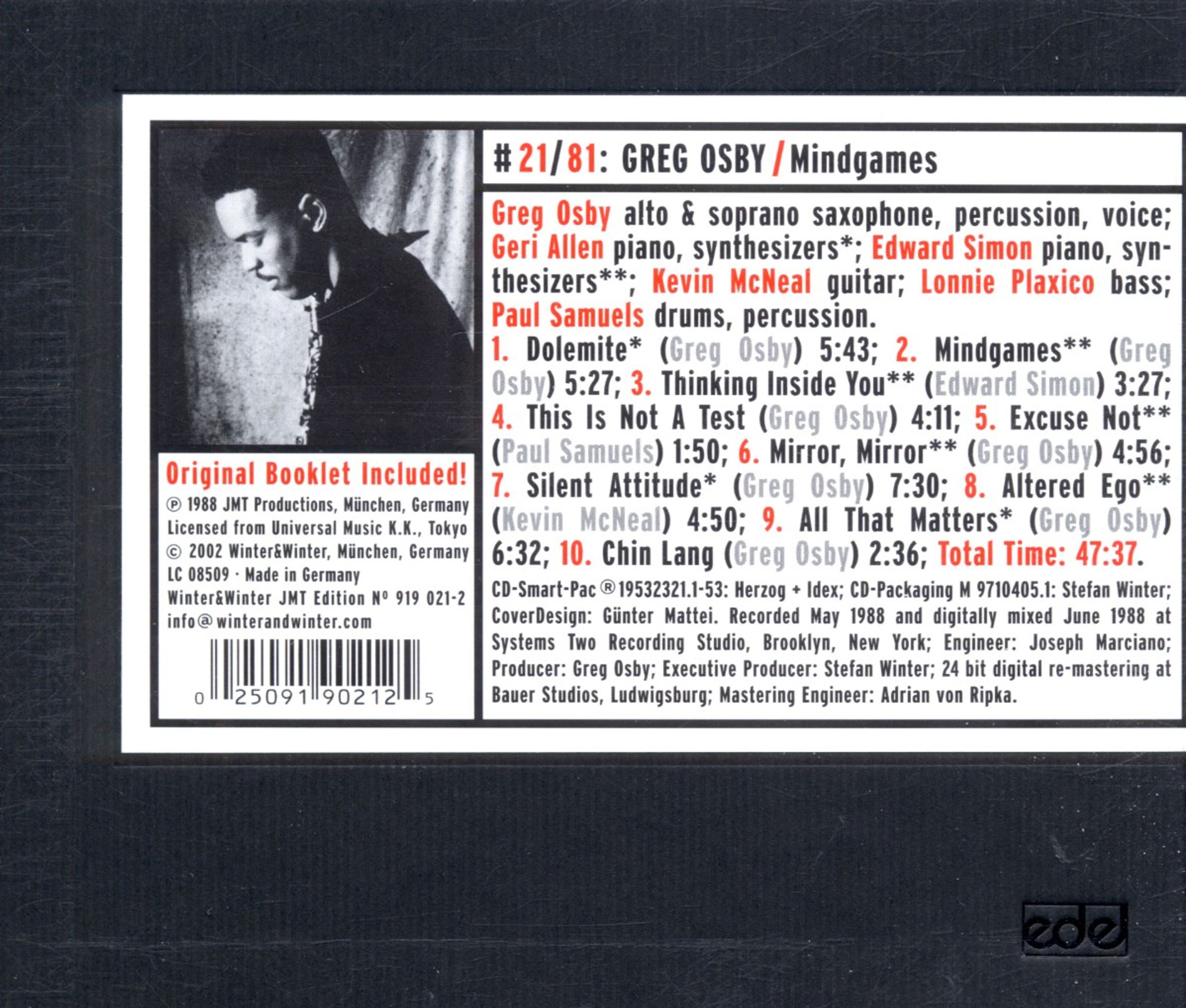 Osbys zweites Album Mindgames knüpft nahtlos an diese Experimentierfreude an und setzt neue Akzente. Die Stücke sind eine spannende Verschmelzung aus sphärischen Balladen, Funk und modernem Jazz-Rock, die eine fast mystische Atmosphäre erzeugen. Osby kombiniert meisterhaft akustische mit elektronischen Klängen und verknüpft abstrakte Melodien mit komplexen Rhythmen.