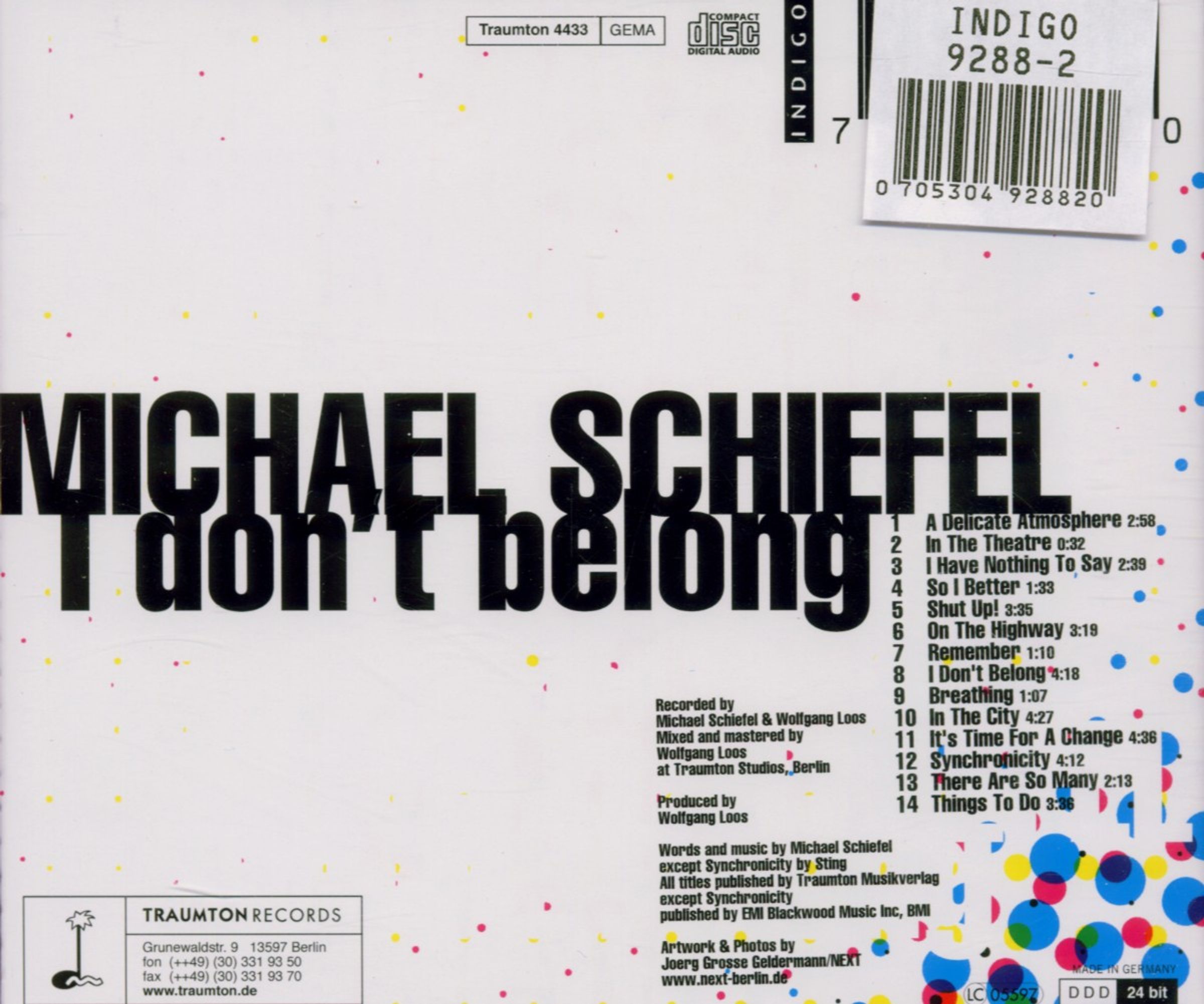 Mit eigenen Projekten wie Jazz Indeed oder den Mosaique 4 Voices verfeinerte Schiefel seinen Stil und so entstand im Sommer 1999 das Album "I Don't Belong", eine Vokalsuite in 14 fortlaufenden Kapiteln, die sich mit Ausnahme eines Police-Klassikers ausschließlich auf Eigenkompositonen stützt. "I Don't Belong" ist eine ebenso angreifbare wie ehrliche Stellungnahme eines neugierig kreativen Künstlers, der sich nicht mit der ästhetischen Normalität zufrieden gibt. "Wenn sich die Musik Michael Schiefels mit einem Attribut kennzeichnen lässt, dann mit jenem: vielfältig" urteilte JAZZTHETIK und JAZZ PODIUM hörte "Ein stimmiges Klangabenteuer par excellence."