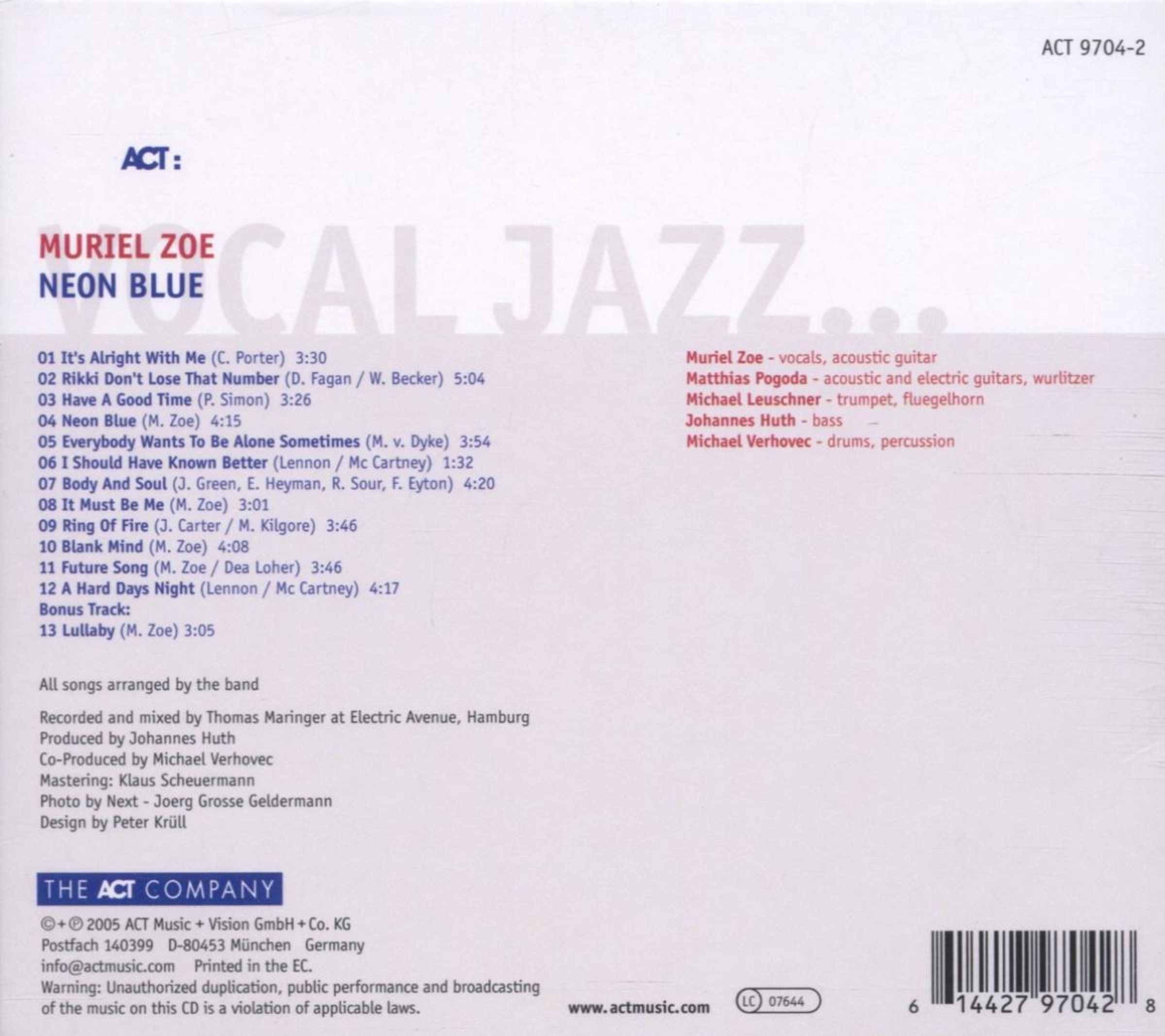 C. Giese in Jazzthetik 4/05: "Als Sängerin und Songschreiberin zeigt sich auch Muriel Zoe auf "Neon Blue". Nummern wie das Titelstück verraten ein Händchen für Melodien, die sich gleich ins Ohr nisten, ohne belanglos zu wirken. Die andere Seite dieser Platte aber sind bekannte Ohrwürmer aus vielerlei Sparten. Cole Porter ist dabei, aber auch Steely Dans ´Rikki Don´t Lose That Number´, der Johnny-Cash-Hit ´Ring of Fire´ oder zwei Beatles-Nummern. All diese Songs steckt Muriel Zoe mit ihrer Klasse-Band um den Bassisten Johannes Huth, der diese Platte auch produzierte, in ein luftiges, nach weitem Land duftendem akustischen Geflecht aus Drums, Bass, Trompete und Konzertgitarre."Disk 1 von 1 (CD)