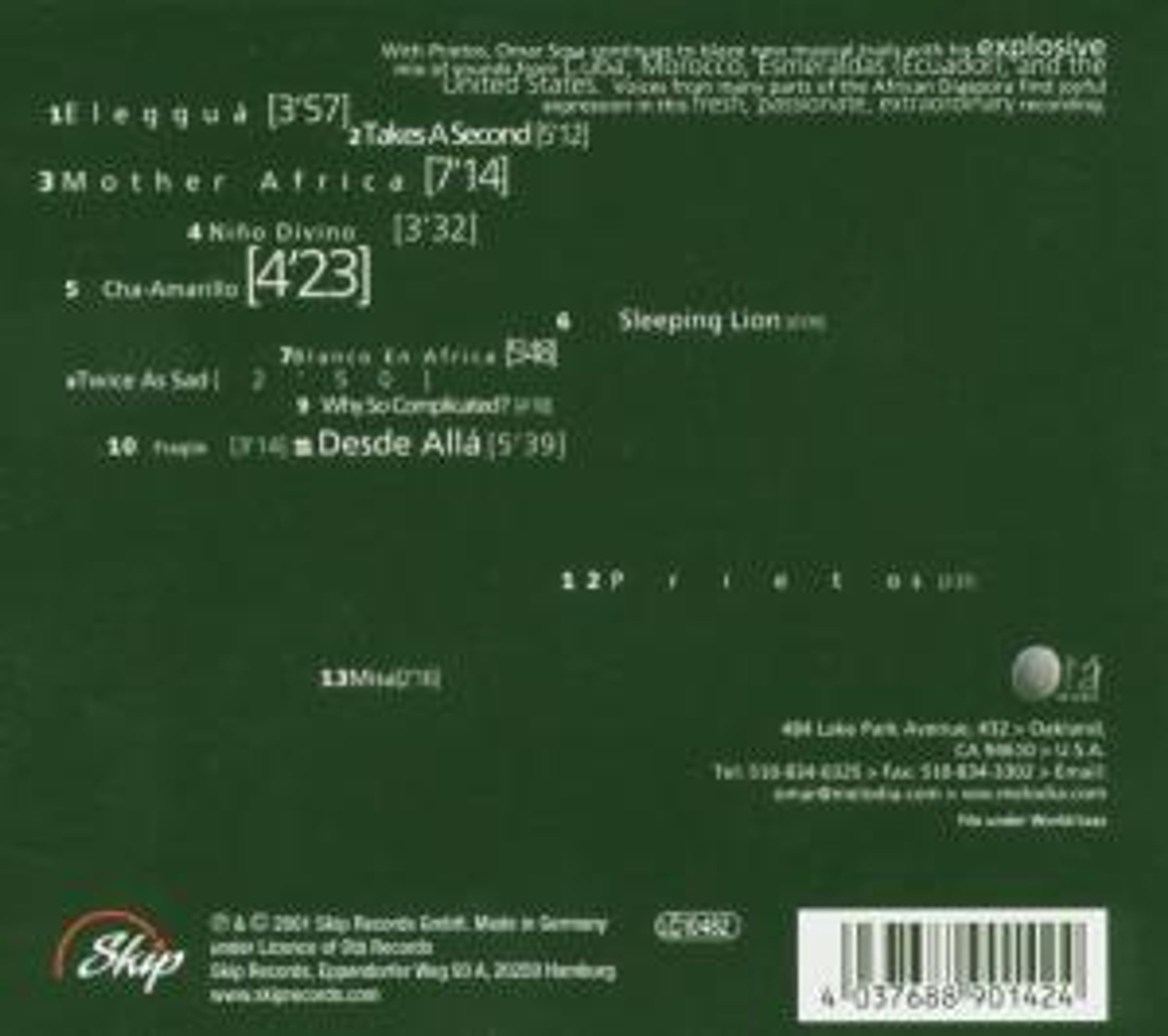 Mit "Prietos", der Fortschreibung und dem vorläufigen Endpunkt seines spektakulären "Large Ensemble Projektes", setzt Omar Sosa seinen extrovertierten musikalischen Kreuzzug fort, indem er zu den Elementen Jazz, Hip Hop, Salsa und Klassik jetzt auch noch Einflüsse aus Nord- und Westafrika hinzu kombiniert. Das Ergebnis ist eine virtuose Session mit annähernd vierzig Musikern aus zehn Ländern, eine einzigartige Melange und "World Music" im ursprünglichsten Sinne. Das spanische Wort Prieto meint "sehr schwarz" und mit dem Titel beschreibt Omar die Tatsache, dass er verschiedene schwarze Kulturen auf diesem Album zusammengeführt hat, die nach seiner Auffassung alle ihren Ausgang bei der gleichen "Mother Africa" nahmen. Der Kubaner hat dabei einen explosiven Mix mit Sounds aus Kuba, Marokko, Ecuador, Venezuela, Brasilien, Burkina Faso, der Elfenbeinküste und den USA arrangiert und gewissermaßen als Klangteppich unter sein bestechendes Pianospiel gelegt.