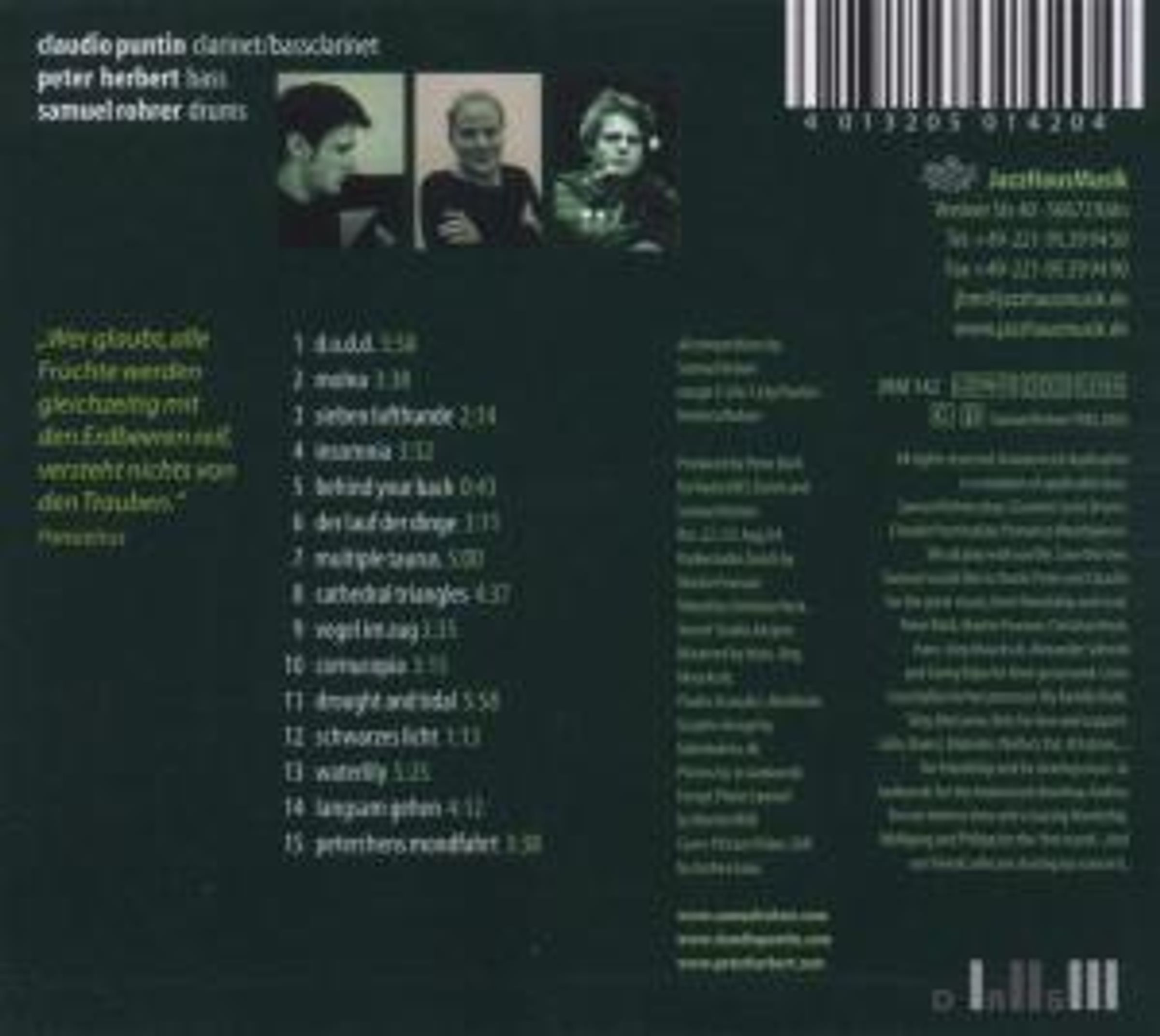 F. v. Ameln in Jazzthing 2-3/06: "Hochintensive Trio- Interaktion mit Ausflügen in den Free-Bereich, konzen- triertem Zusammenspiel und bemerkenswertem Gefühl für Stimmungsnuancen. Rohrer hat seine vor allem melodisch ausdrucksvollen Kompositionen dem Klarinettisten Claudio Puntin auf den Leib geschrieben, dessen Spiel - neben der eindrucksvollen technischen Leistung - bis zum letzten Ton berührt und gefangen nimmt."Disk 1 von 1 (CD)