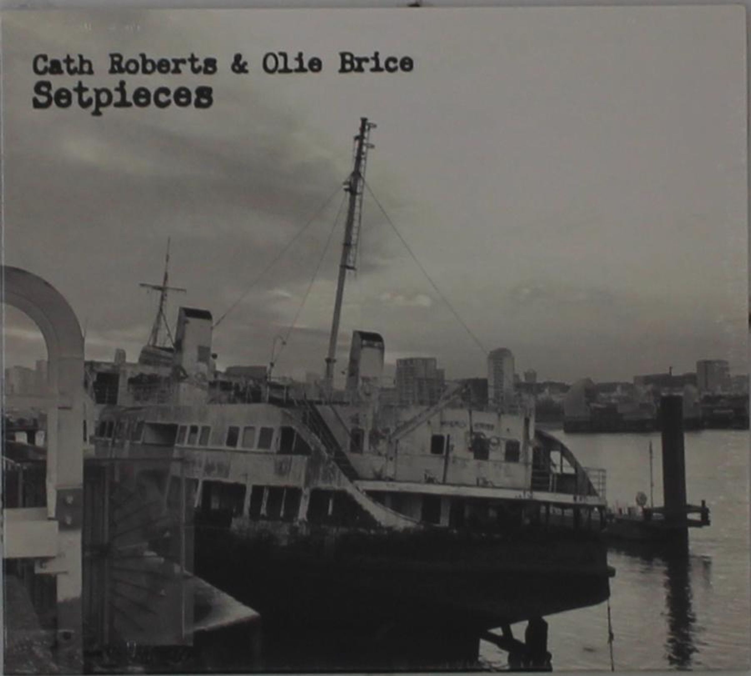Text: "Cath Roberts & Olie Brice Setpieces". Schwarz-weißes Foto eines alten, verfallenen Schiffs am Wasser vor Stadt-Skyline., CD
