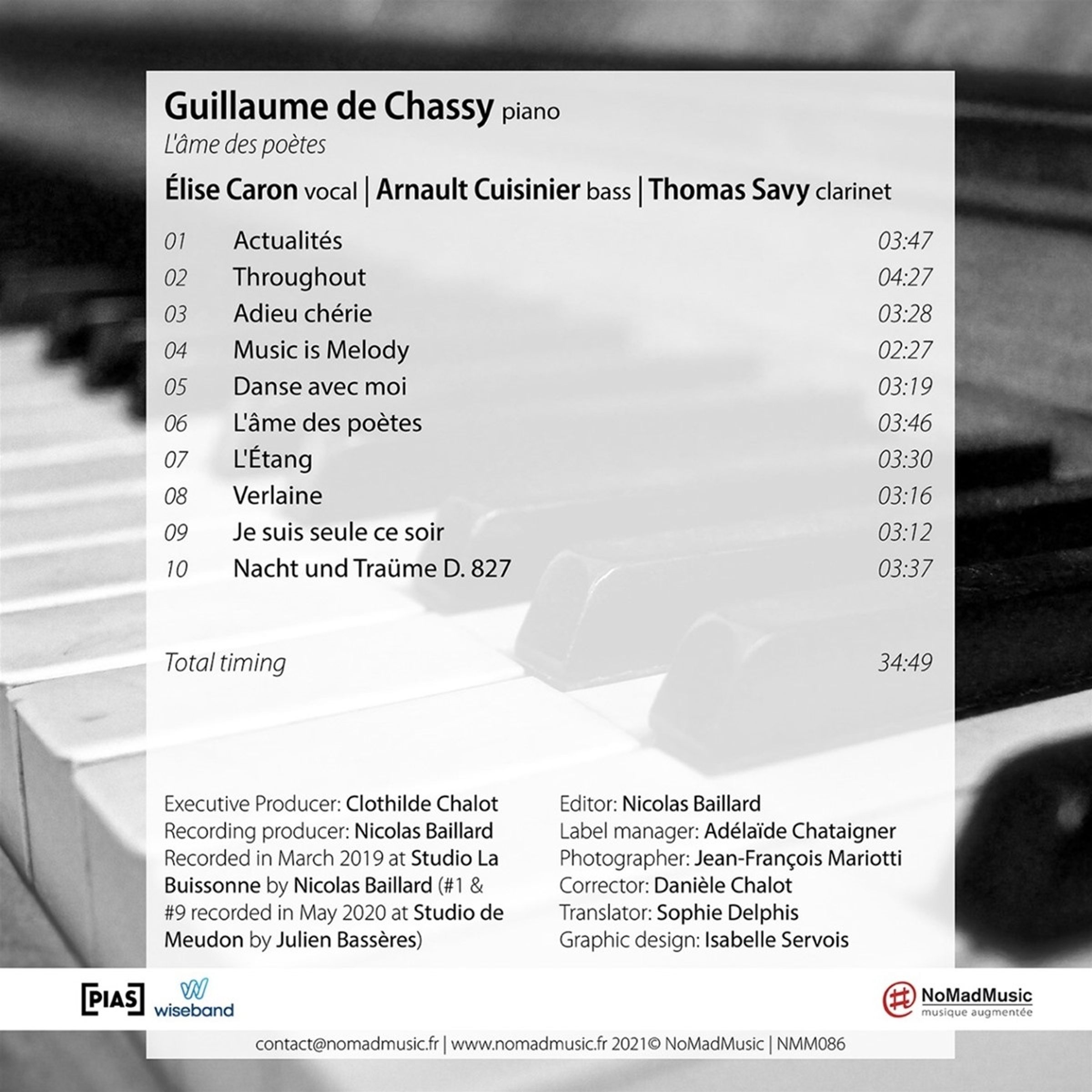 Mit „L’âme des poètes“, seinem bereits vierten Album für NoMadMusic, zollt Guillaume de Chassy der Kunst der schönen Melodie Tribut. Von Charles Trénet bis zu Franz Schubert und von Sergei Prokofjew bis zu Bill Frisell reicht das Spektrum der Komponisten, deren Stücke den Pianisten besonders berühren. An seiner Seite sind die Sängerin Elise Caron, der Kontrabassist Arnault Cuisinier und der Saxofonist Thomas Savy zu hören.