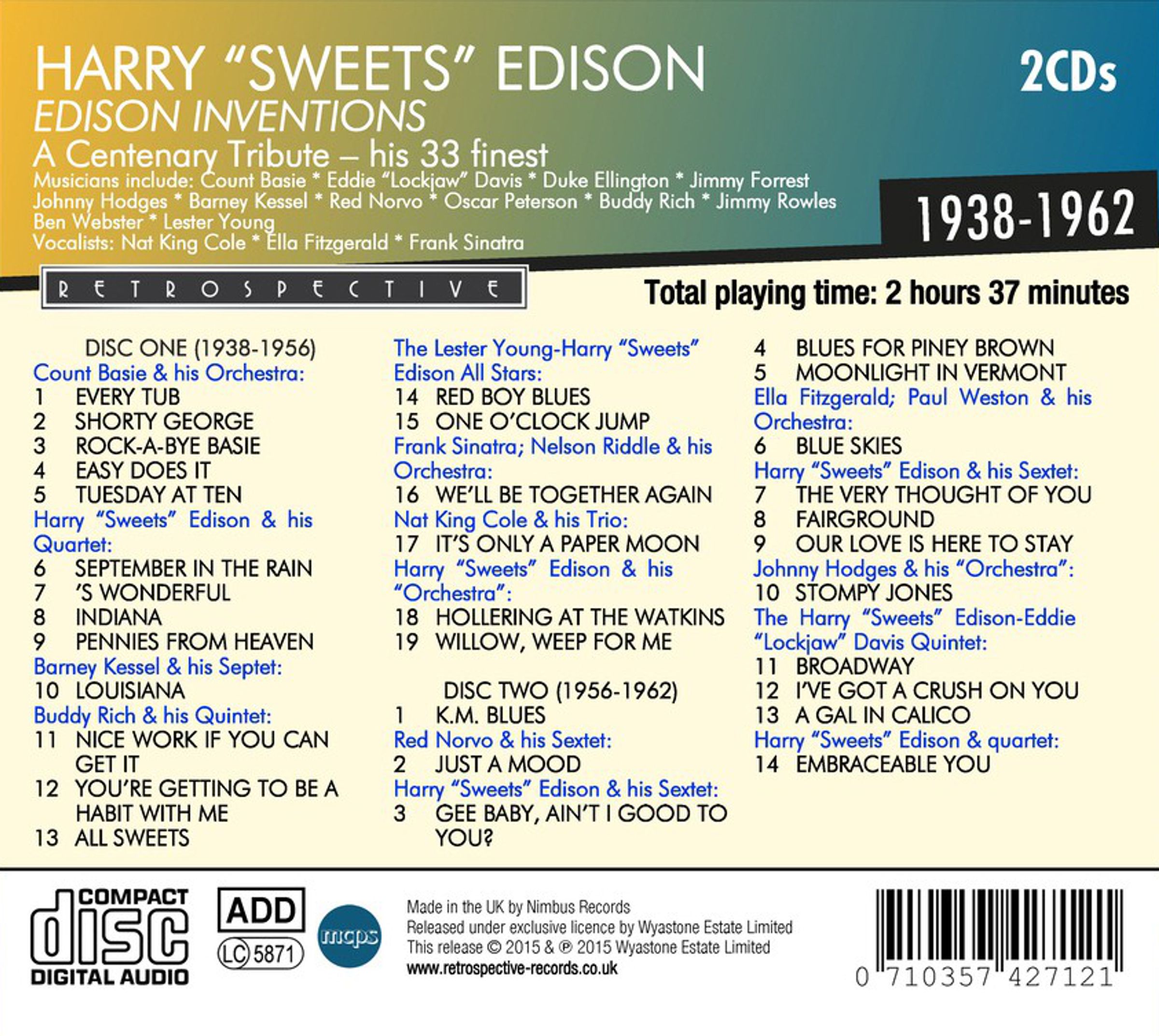Aufgrund seiner Beliebtheit bei den Mädchen gab Lester Young Harry Edison (1915–1999) den Spitznamen »Sweets«. Doch wie der Notenschreiber Digby Fairweather bemerkt, verbarg sich unter dieser Süße ein Jazz-Eroberer, der sich seinen eigenen Platz am Jazz-Firmament erschuf – und sein Vermächtnis ist hier auf Retrospectives »Edison Inventions« zu finden. Er mag nie die innovative Vielseitigkeit seines Vorfahren Thomas erreicht haben.