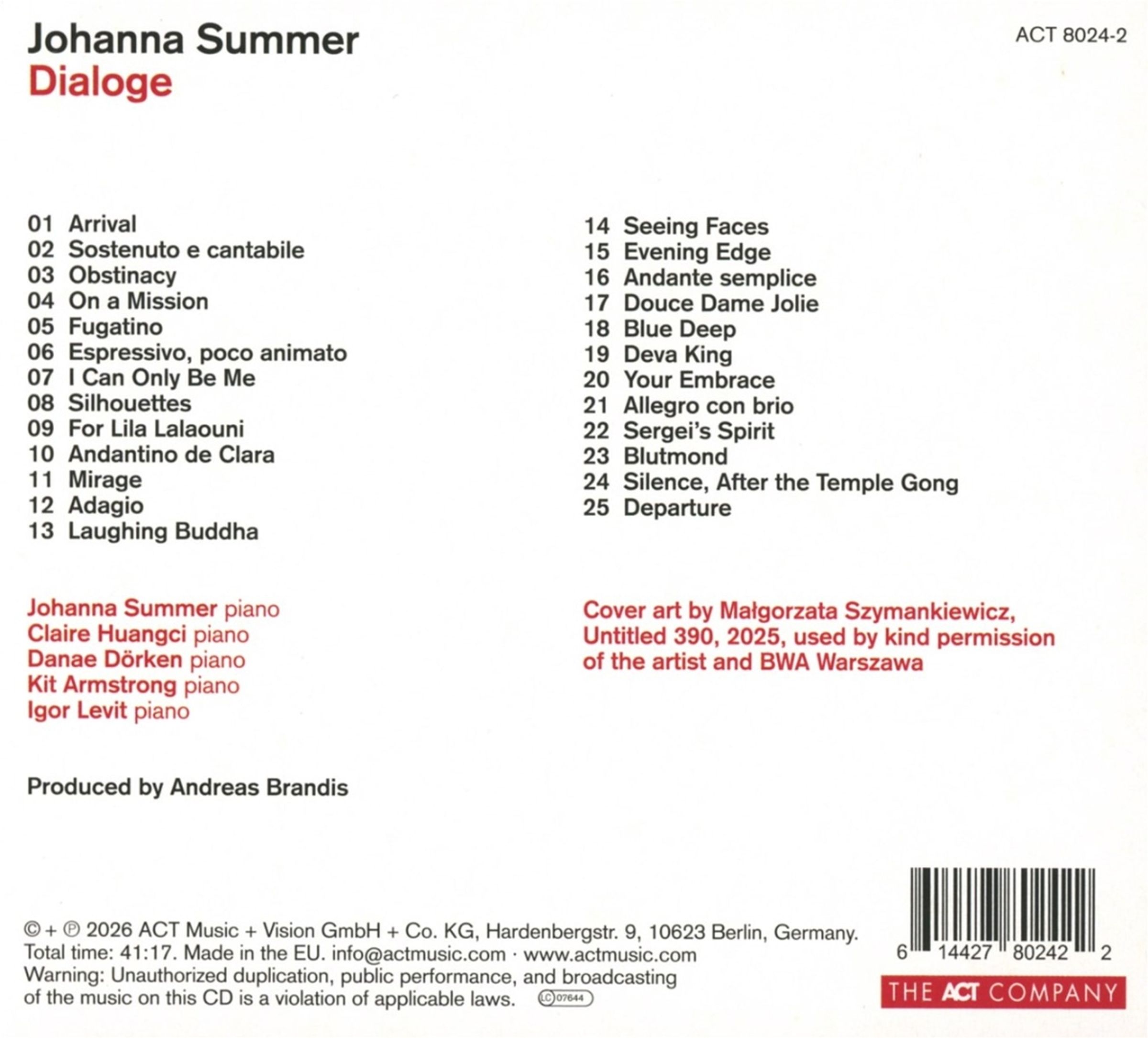 Dieser Ansatz begeisterte auch Igor Levit, der sie 2023 und 2024 zu dem von ihm kuratierten „Klavier-Fest“ des renommierten Lucerne Festivals einlud. Dort trat Summer nicht nur solo, sondern darüber hinaus im Duo gemeinsam mit Levit auf. Hier entstand Ungehörtes: Levit stellte Sätze aus Robert Schumanns „Waldszenen“ in den Raum, Summer antwortet darauf mit einer Improvisation. Mit ihrem Programm „Dialoge“ und dem im Frühjahr 2026 auf ACT erscheinenden Album führt Johanna Summer das Konzept des gemeinsamen Erforschens und Weiter-Erzählens klassischer Werke fort. Live trifft sie dafür auf Duo-PartnerInnen wie Claire Huangci, Danae Dörken und Kit Armstrong.