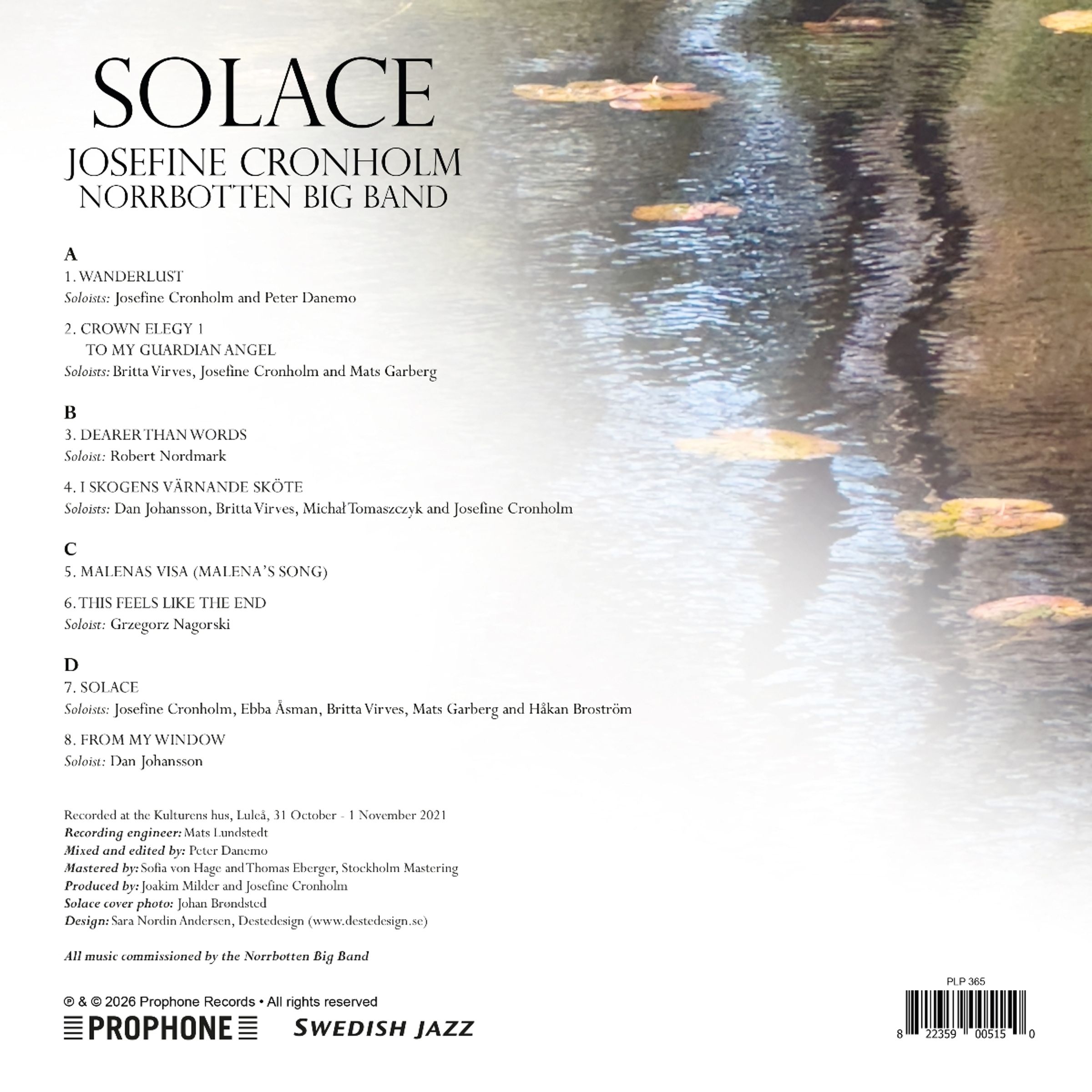 "Solace" ist das Ergebnis einer Zusammenarbeit zwischen der Sangerin Josefine Cronholm und der Norrbotten Big Band. Das Projekt entstand anlasslich ihres 50. Geburtstags und vereint eigens in Auftrag gegebene Kompositionen von Kunstlern und Kunstlerinnen aus ihrem kunstlerischen Umfeld. Die musikalische Leitung lag bei Joakim Milder. Die Werke spiegeln unterschiedliche kompositorische Handschriften und eroffnen vielfaltige Perspektiven auf