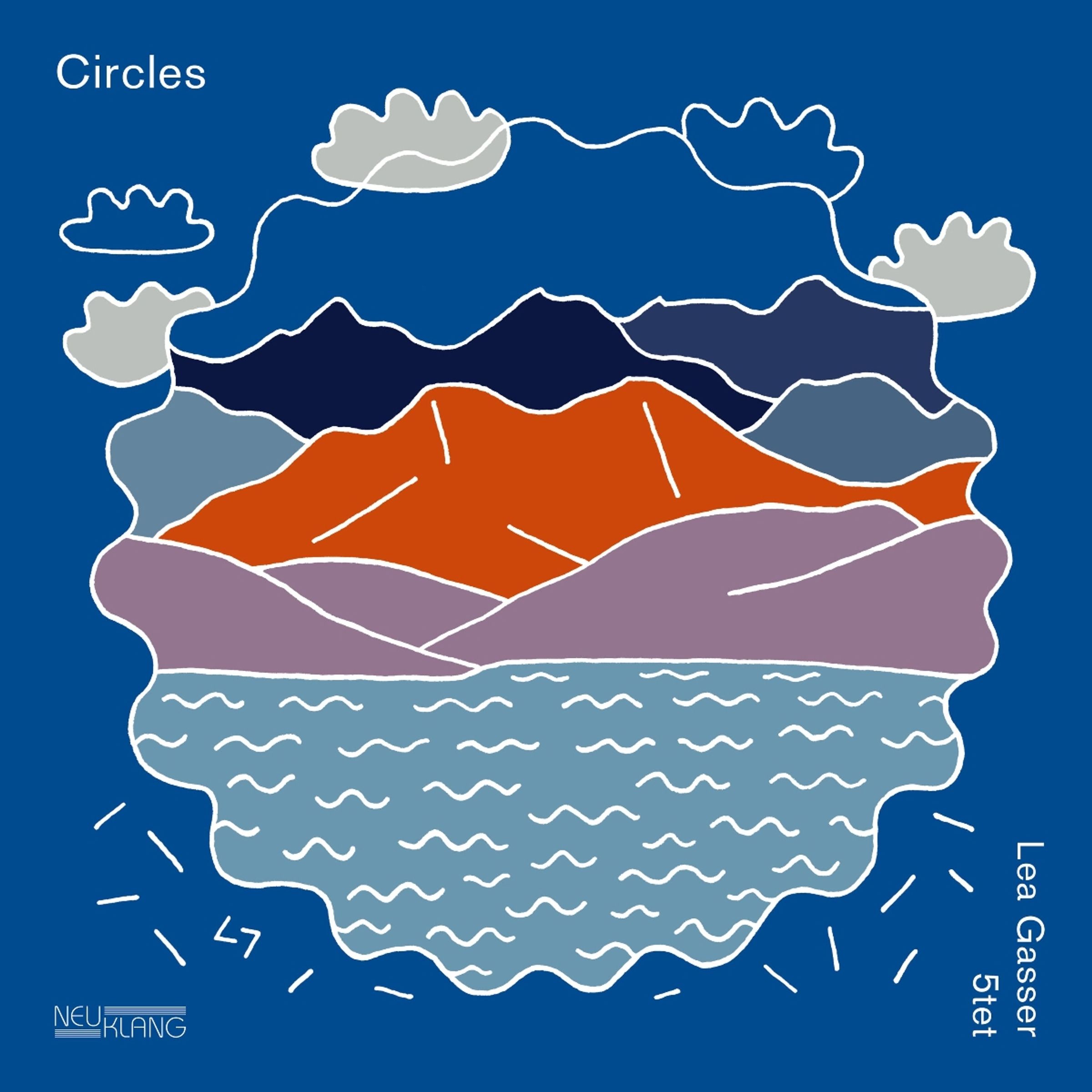„Circles“, „Lea Gasser 5tet“; Illustration mit Bergen, Wasser und Wolken in Blau, Orange und Violett., LP