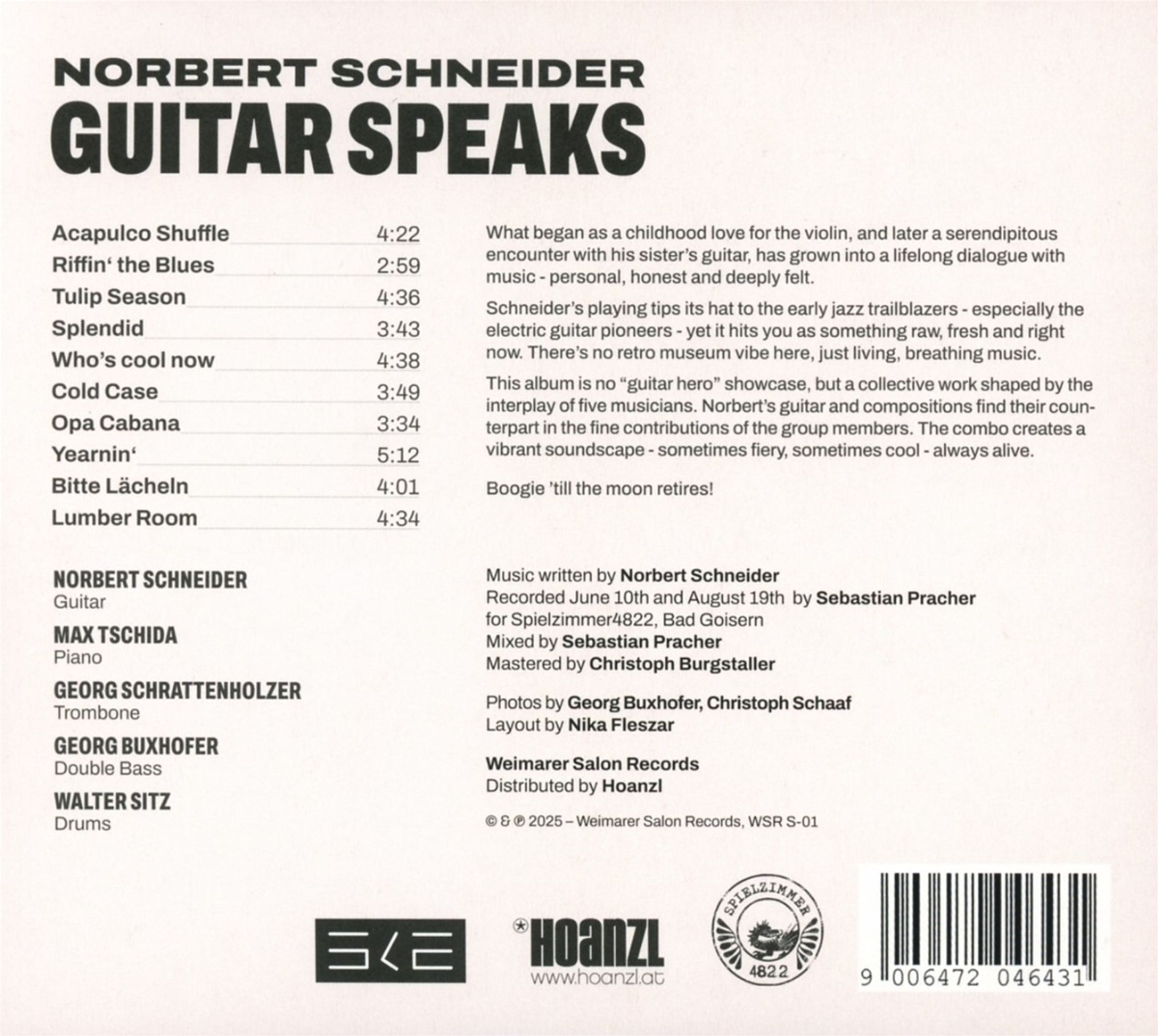 Max Tschida am Klavier und Georg Schrattenholzer an der Posaune sind mit wunderbaren Soloeinlagen zu hören. Georg Buxhofer am Kontrabass und Walter Sitz am Schlagzeug formen einen mal heißen, mal coolen - aber immer wohligen - rhythmischen Teppich, auf dem wir Solisten dann sitzen, liegen oder fliegen können.“