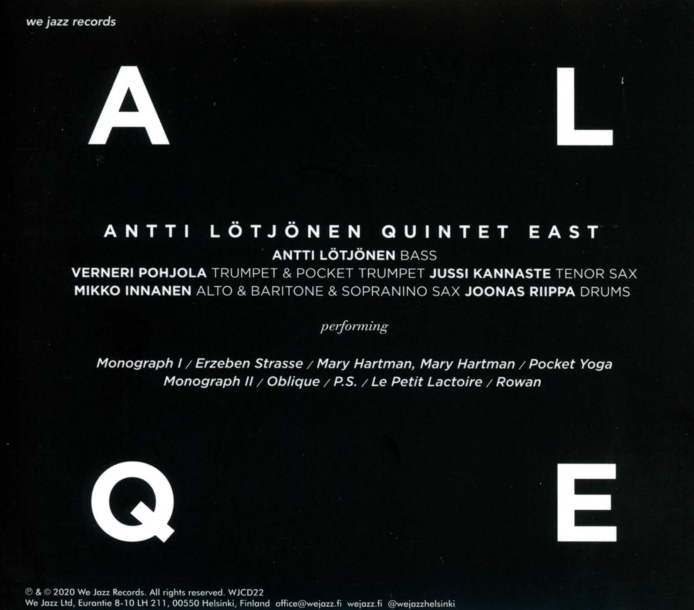 Bassist Antti Lötjönen, einer der angesehensten und aktivsten Musiker der finnischen Jazzszene, ist mit seinem Debütalbum als Leader bei Helsinkis We Jazz Records einen Schritt voraus. Das »Quintet East« besteht aus den Hartgesottenen Verneri Pohjola an der Trompete, Mikko Innanen (von Koma Saxo) und Jussi Kannaste (von 3TM) am Saxophon sowie Joonas Riippa am Schlagzeug.