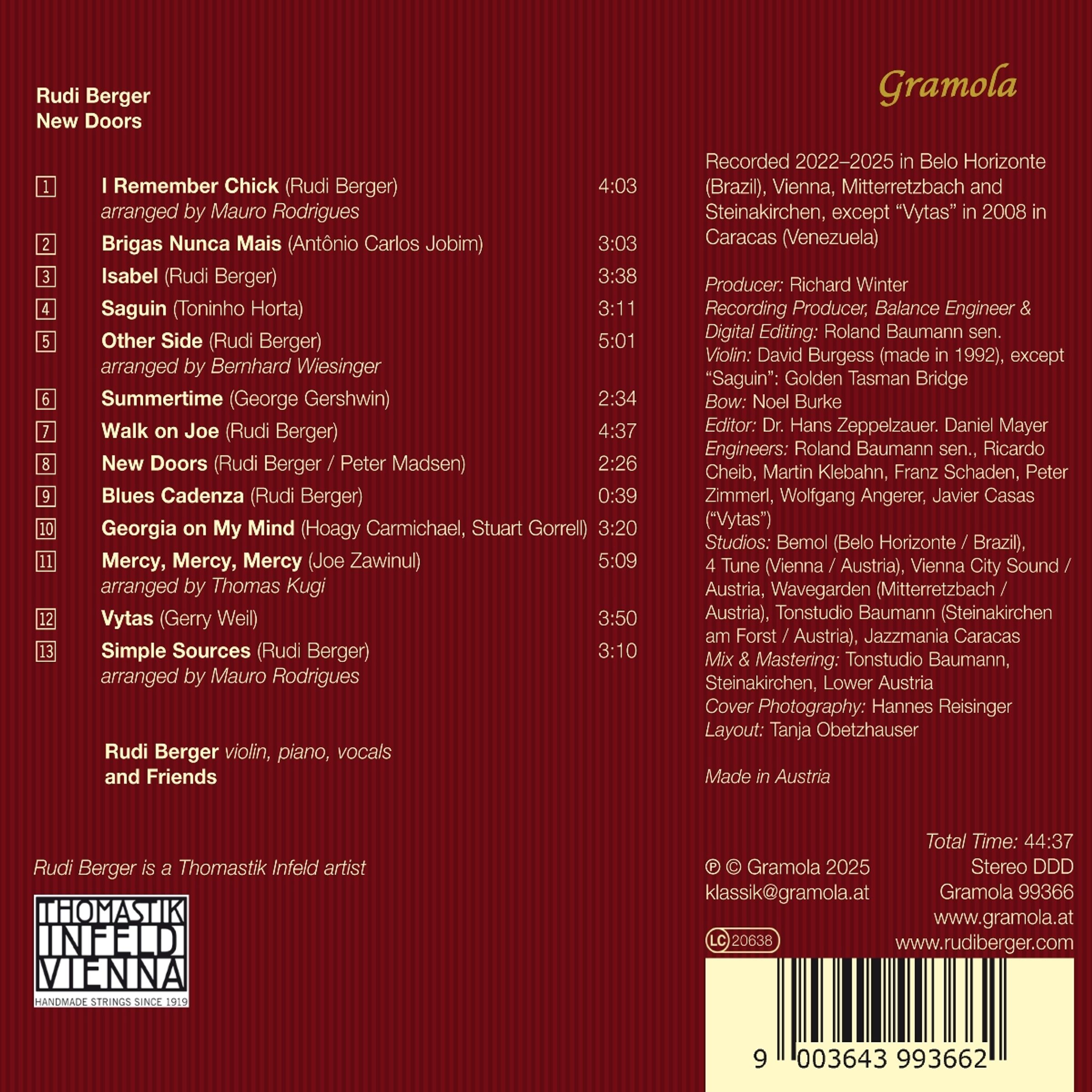 Auf seinem jungsten Album "New Doors" verbindet der international reussierende Wiener Jazzgeiger Rudi Berger die drei Welten, die ihn seit seinen Anfangen massgeblich pragten: Die Achse Wien - Brasilien - New York bescherte dem Virtuosen eine Vielzahl an musikalischen Weggefahrten wie die brasilianischen Gitarristen Toninho Horta und Fabiano Chagas, die ebenfalls brasilianischen Mauro Rodrigues, Flote und Oswaldo Amorim, Bass, die Osterreicher