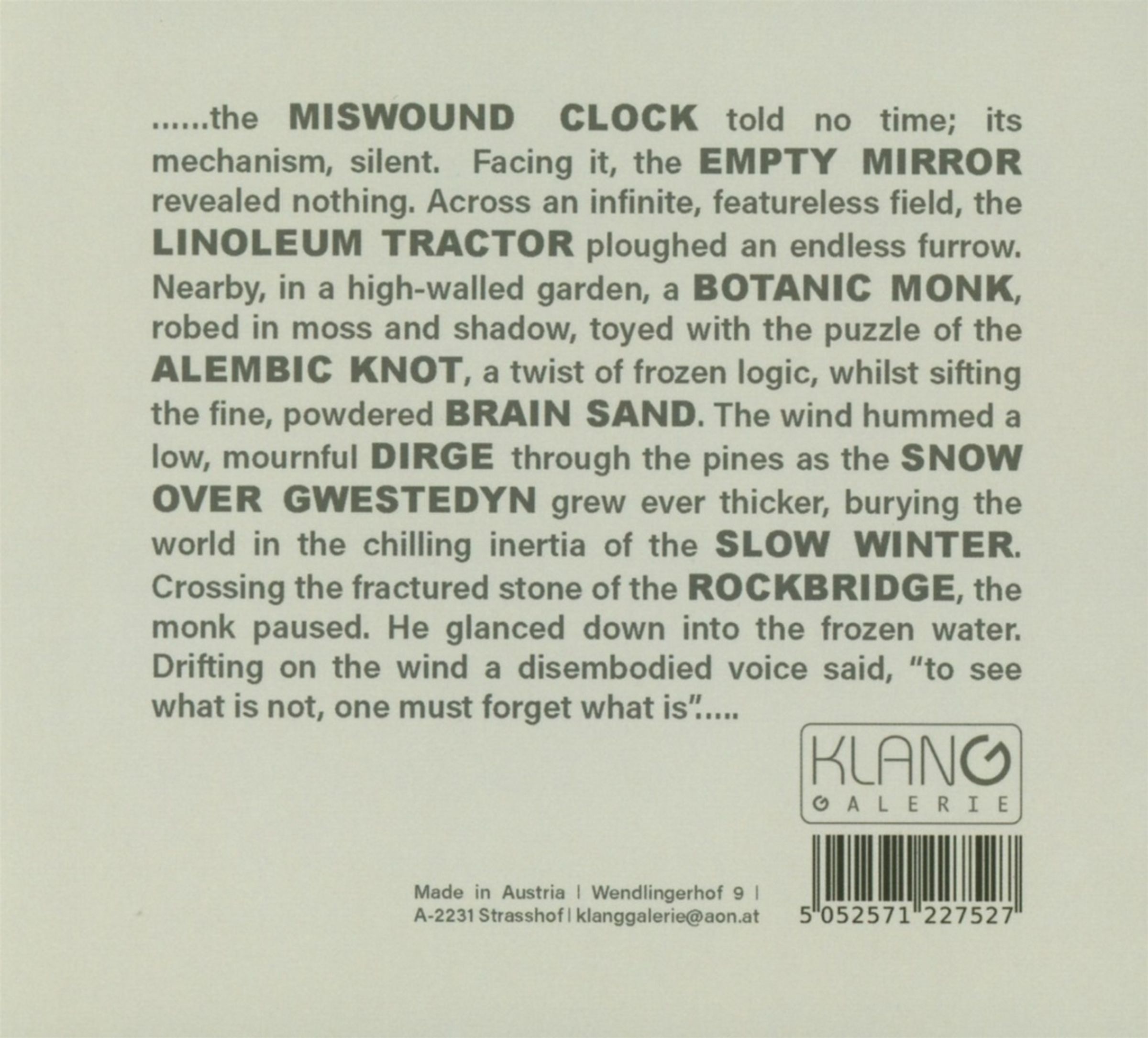 Klanggalerie veröffentlichte bereits fünf Alben dieses Projekts: »Sonic Archeology«, »Hydrogen Kaleidoscope«, »The Entomology Of Sound«, »Locum Windsock« und die Darkening-Scale-Neuinterpretation von »Duck Stab« von The Residents, »Stuck Bad«. Nach einer mehrjährigen Pause meldet sich Darkening Scale nun zurück. Das Projekt »The Empty Mirror« begann schon 2022, zog sich durch Überarbeitungen aber über die folgenden drei Jahre.