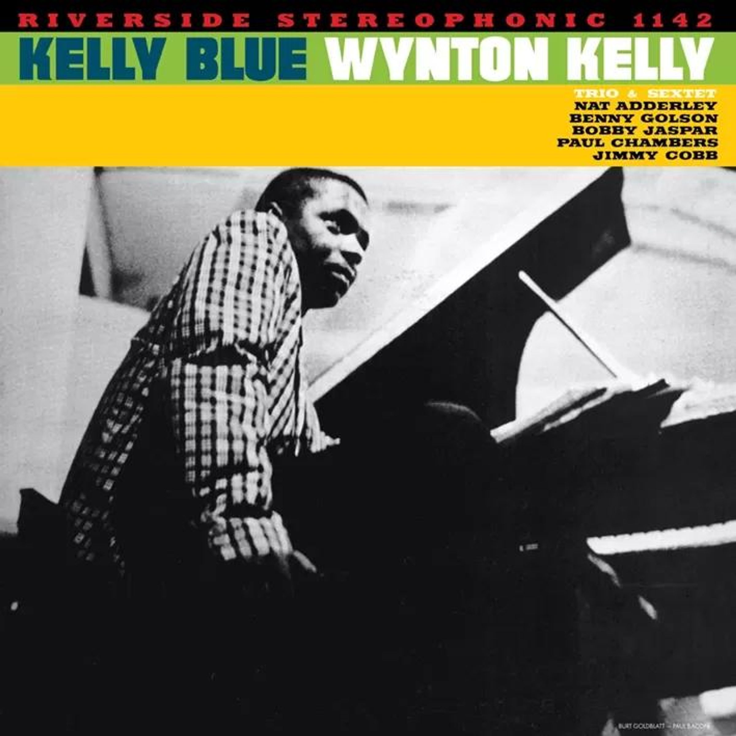 "KELLY BLUE WYNTON KELLY" oben in grün und blau. Musiker spielt Klavier, trägt kariertes Hemd., 2 LPs