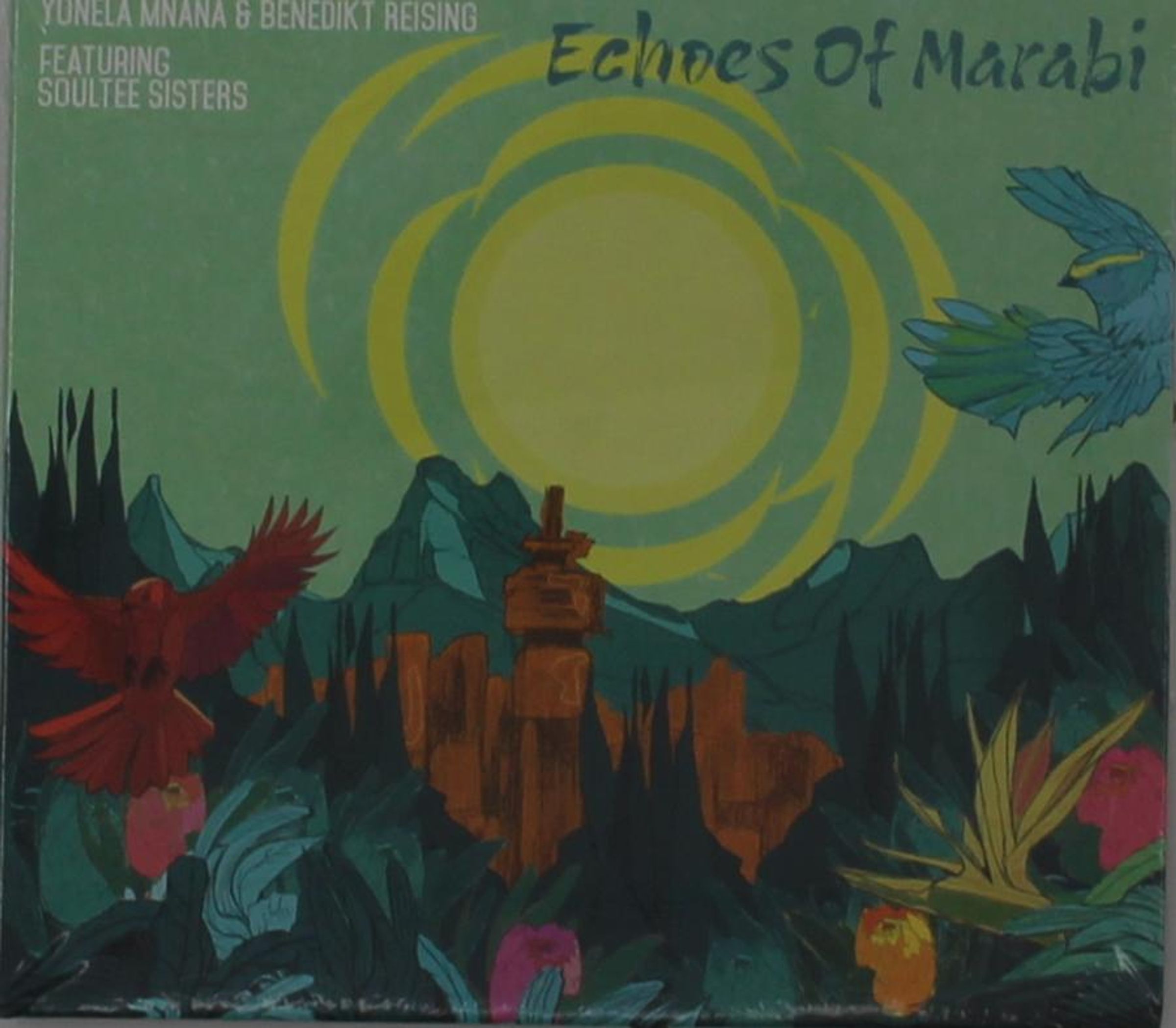 Echoes Of Marabi. Yonela Mnana & Benedikt Reising featuring Soultee Sisters. Illustration von Vögeln und Bergen im Hintergrund., CD
