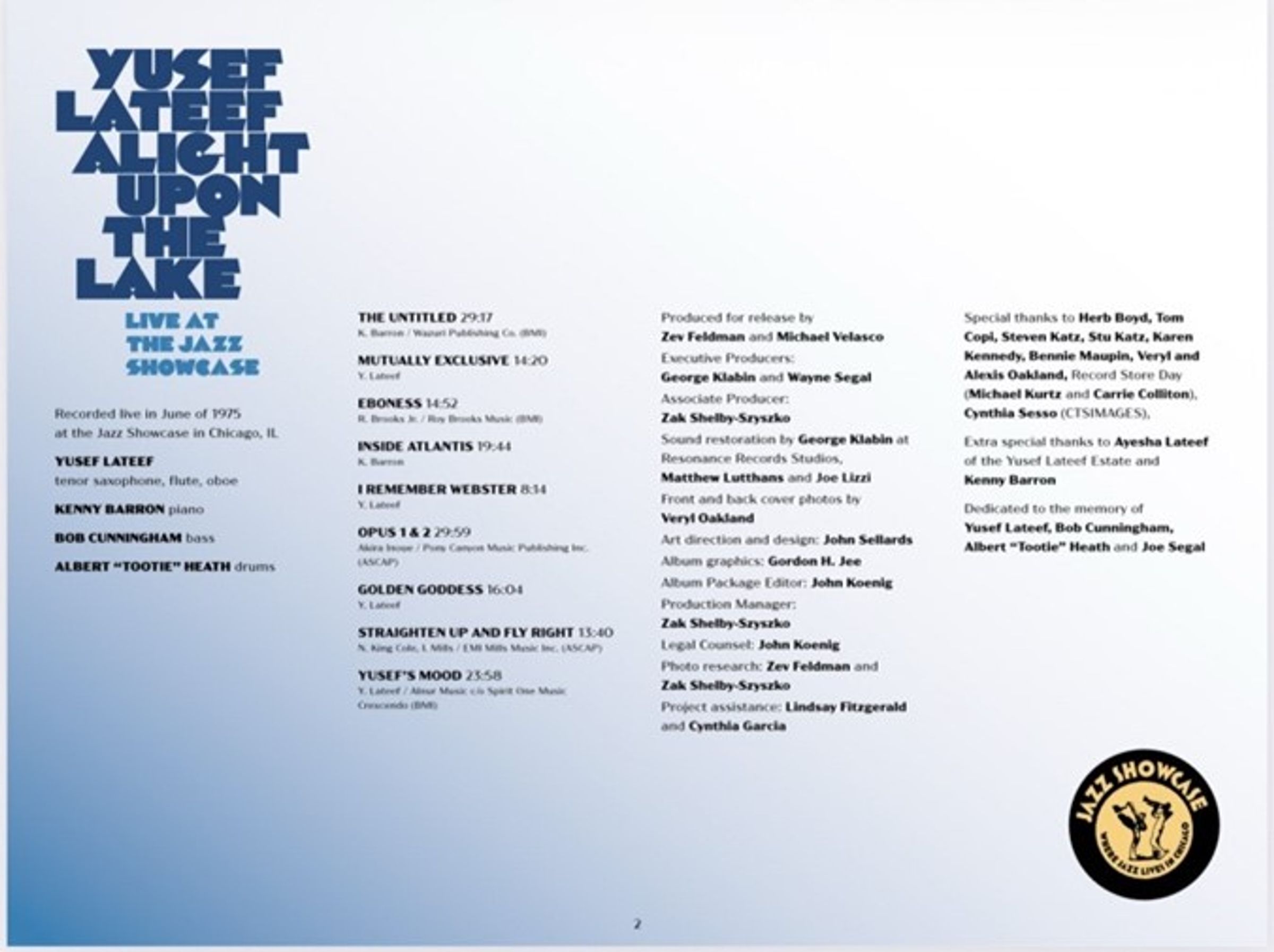 »Alight Upon the Lake: Live at the Jazz Showcase« ist eine bisher unveröffentlichte Aufnahme des legendären Holzbläsers und Multiinstrumentalisten Yusef Lateef mit dem Pianisten Kenny Barron, dem Bassisten Bob Cunningham und dem Schlagzeuger Albert »Tootie« Heath. Die Live-Aufnahme entstand im Juni 1975 in Joe Segals Jazz Showcase in Chicago, Illinois. Das 3er-Set wurde von den Originalbändern von Toningenieur Matthew Lutthans im The Mastering Lab in Salina, Kansas, gemastert. Die Deluxe-Edition enthält neu zusammengestellte Liner Notes von Lateefs Biografen Herb Boyd sowie Interviews mit dem Holzbläser-Meister und Lateef-Schüler Bennie Maupin, Joe Segals Sohn Wayne Segal und anderen.