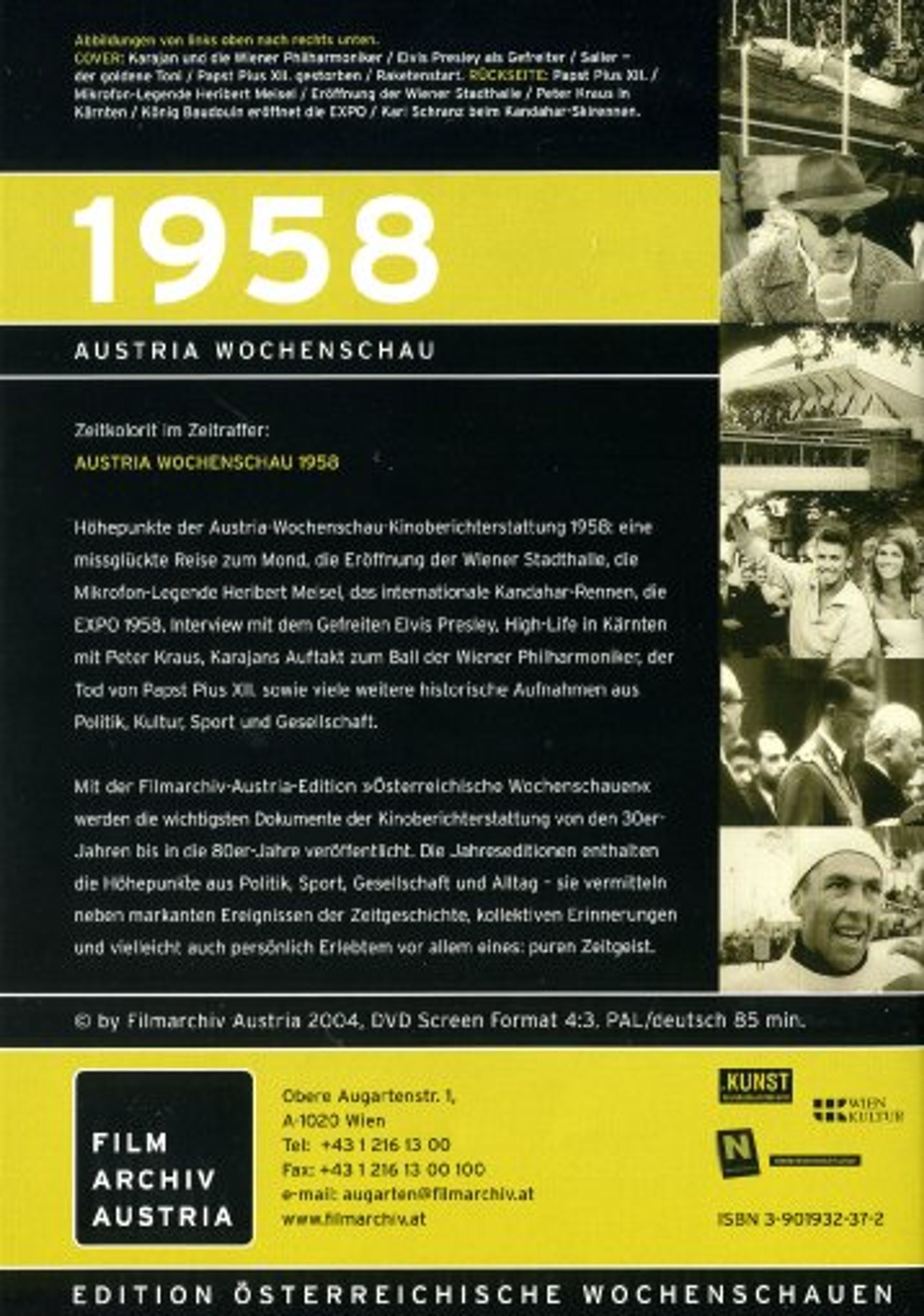 Höhepunkte der Austria-Wochenschau-Kinoberichterstattung 1958: eine missglückte Reise zum Mond, die Eröffnung der Wiener Stadthalle, die Mikrofon-Legende Heribert Meisel, das internationale Kandahar-Rennen, die EXPO 1958, Interview mit dem Gefreiten Elvis Presley, High-Life im Kärntner mit Peter Kraus, Karajans Auftakt zum Ball der Wiener Philharmoniker, der Tod von Papst Pius XII sowie viele weitere historische Aufnahmen aus Politik, Kultur, Sport und Gesellschaft.