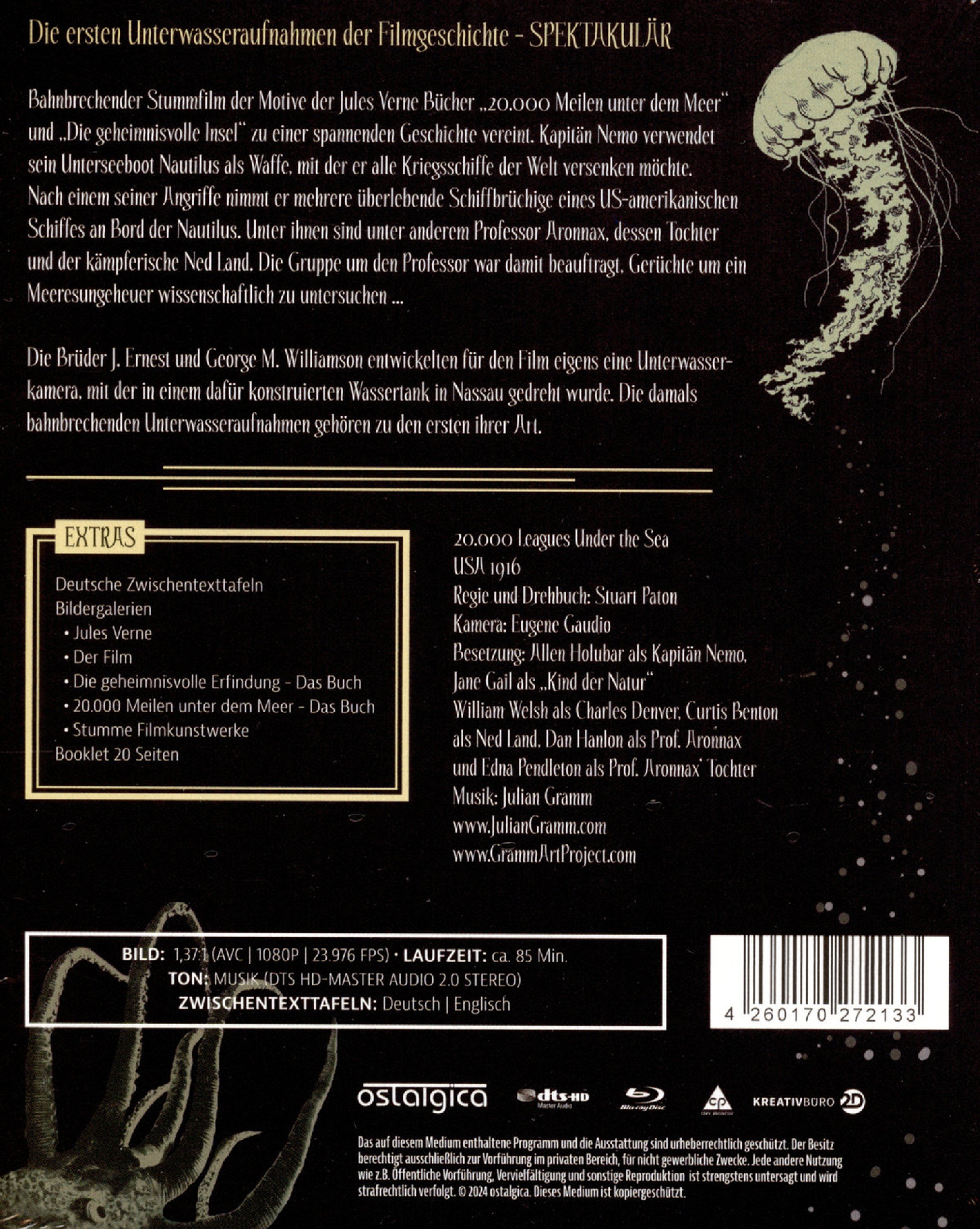 Bahnbrechender Stummfilm der Motive der Jules Verne Bücher »20.000 Meilen unter dem Meer« und »Die geheimnisvolle Insel« zu einer spannenden Geschichte vereint.